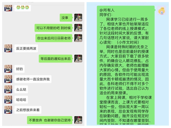 疫情导致无法实习,又不能回家,只能待在出租屋里。人文艺术学院辅导员徐超的学生就遇到了这样的情况。这位学生只身困在深圳,加上考试不顺利可能影响毕业,心理压力很大,情绪消极,甚至不配合学校的各项信息统计。徐超通过电话、QQ、微信与学生保持联系,关心他的生活起居,指导如何防疫,沟通重修事宜。“疫情期间徐老师时刻‘在线’,句句温暖有力量的话语让我重拾信心”,该同学如是说到。