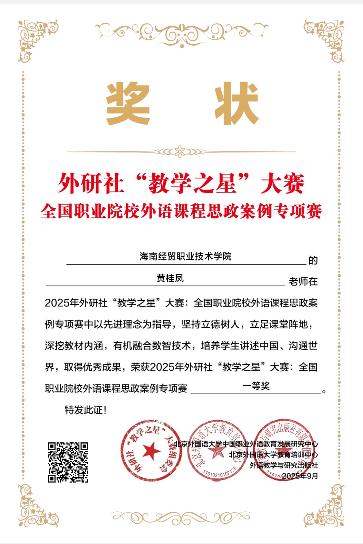 近日,2025年外研社“教学之星”大赛全国职业院校外语课程思政案例专项赛圆满结束。海南经贸职业技术学院外国语学院教师黄桂凤的参赛作品 《新视野商务英语综合教程.1(第二版)“第一单元:公司介绍”荣获高职英语组一等奖。