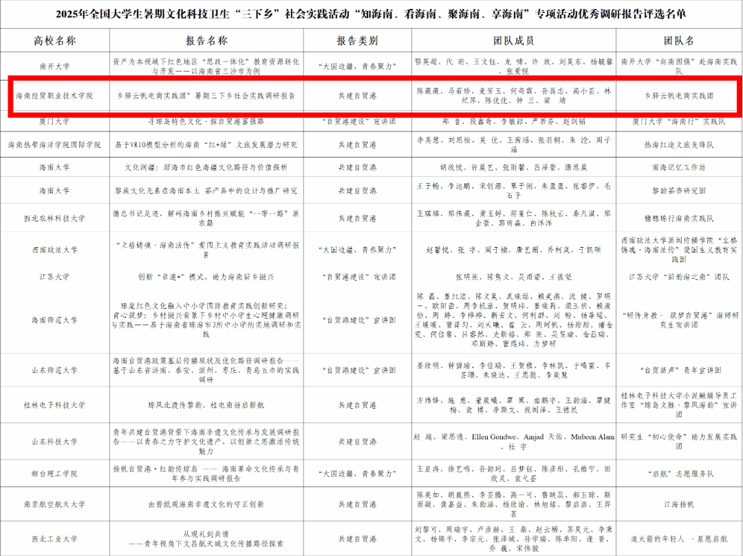 近日,2025年全国大学生暑期“三下乡”社会实践“知海南、看海南、聚海南、享海南”专项活动评审结果正式公示。海南经贸职业技术学院国际贸易学院“乡驿云帆电商实践团”提交的调研报告,凭借扎实的调研基础、深入的问题剖析和切实可行的对策建议,在评选中脱颖而出,获评“优秀调研报告”。