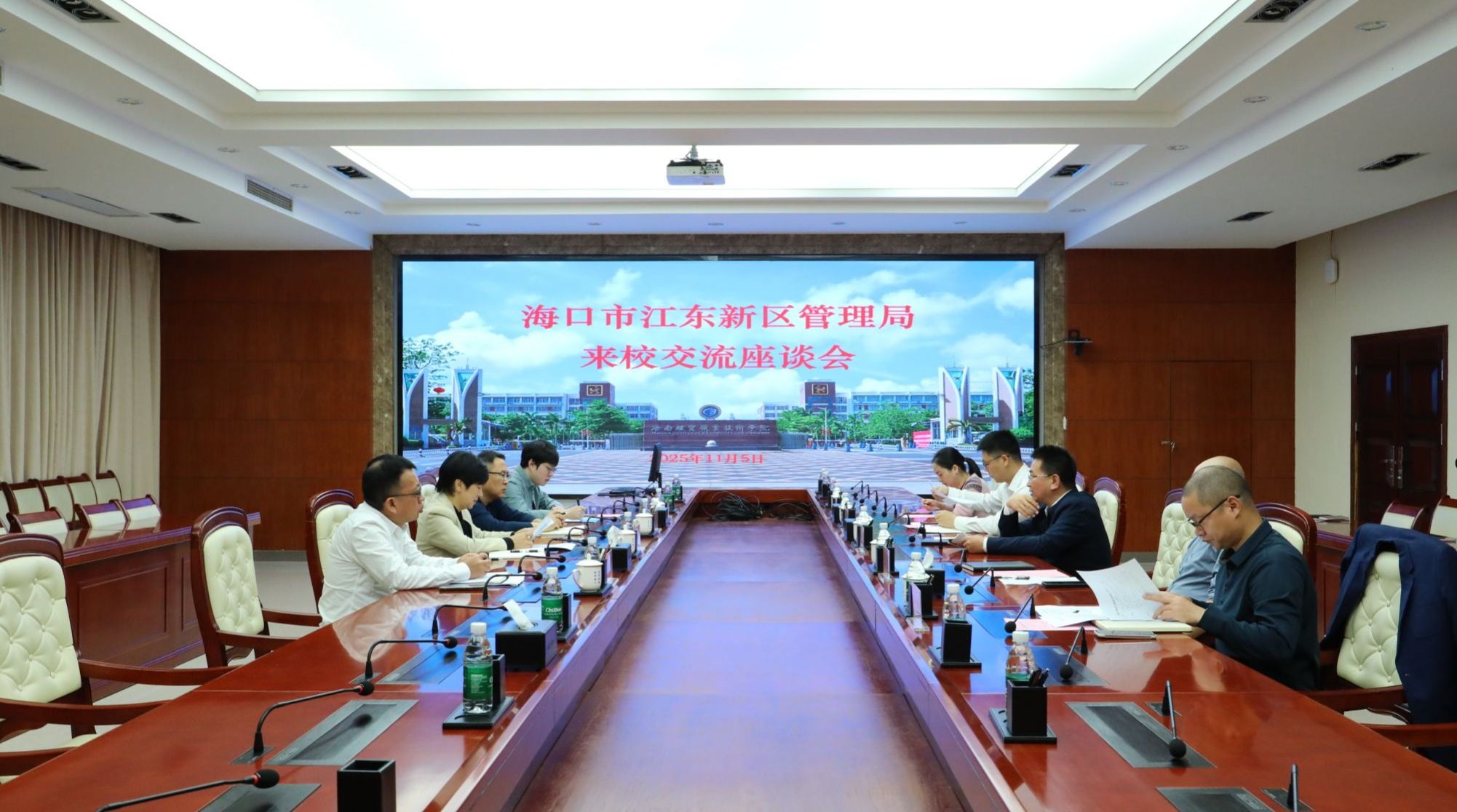 2025年11月5日,海口市江东新区管理局党委委员、副局长汪岩一行4人来到海南经贸职业技术学院,研究讨论江东新区数字贸易产教联合体建设的实施方案、任务分工等事宜。学校党委副书记、校长崔昌华出席座谈会。