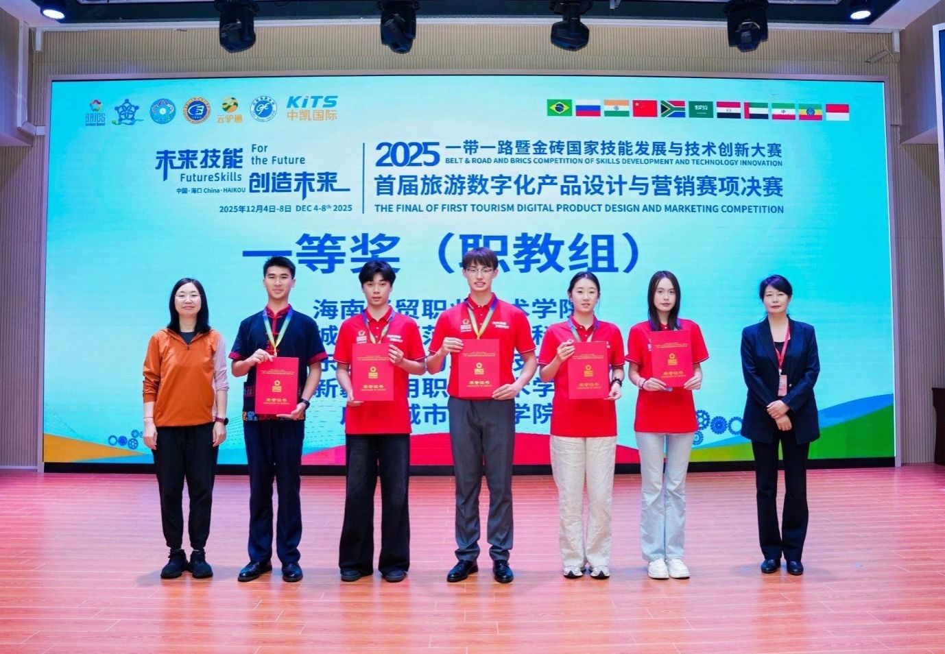 2025年12月5日-7日,一带一路暨金砖国家技能发展与技术创新大赛首届旅游数字化产品设计与营销赛项全国总决赛在海南经贸职业技术学院顺利举行。全国66支优秀参赛队伍齐聚海口,以数字技术为笔、以文旅创意为墨,在椰城上演一场“数字+旅游”的技能盛宴。海南经贸职业技术学院在本次比赛中荣获职教组和教师组两个一等奖。