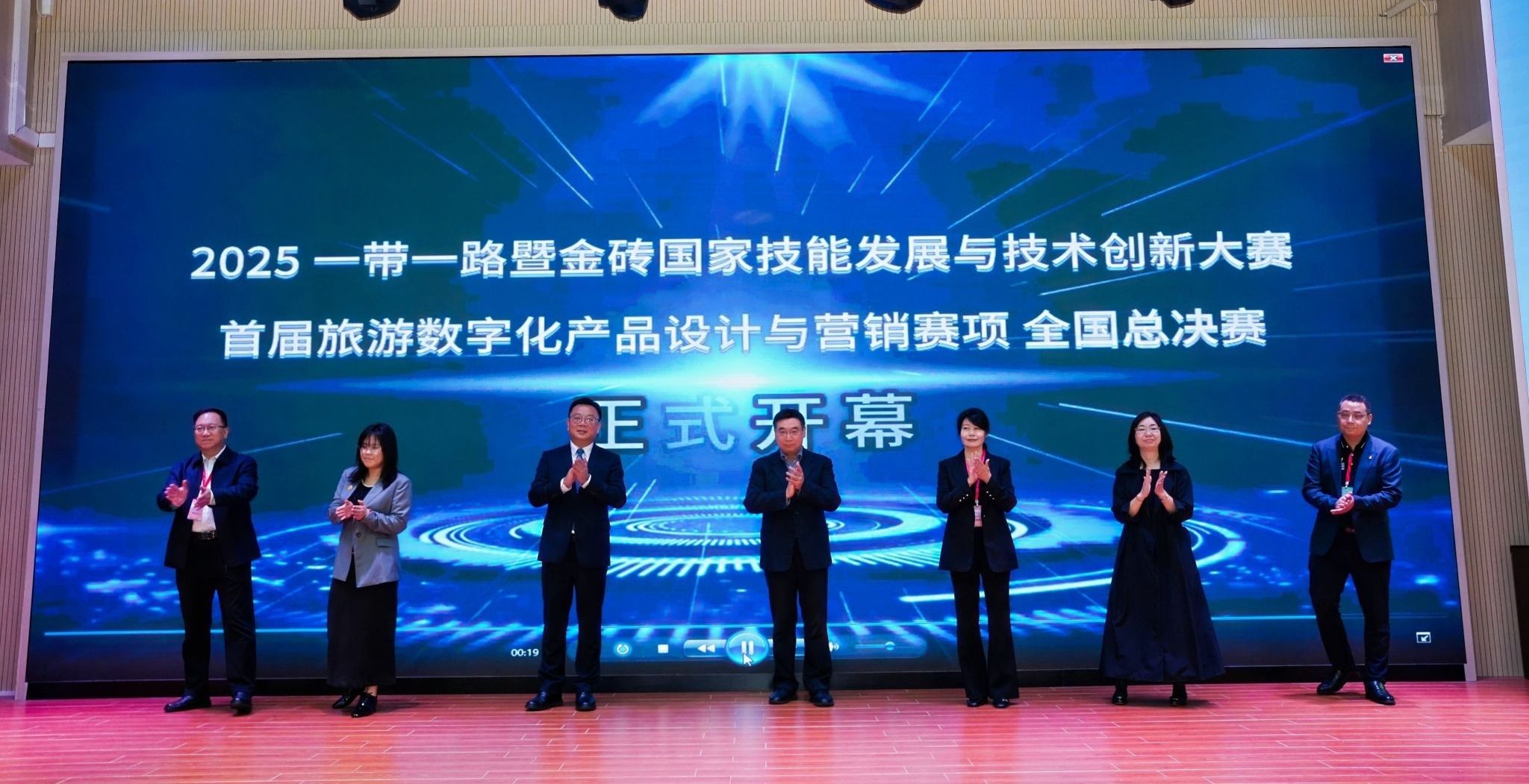 开幕式上,一带一路暨金砖国家技能发展国际联盟理事长刘振英,安徽云驴通信息技术有限公司总经理程伟勇分别代表主办单位和协办单位致辞。裁判员代表蒋新国和参赛选手代表陈柏瑾分别宣誓。在热烈掌声中,赛项总顾问、全国旅游职业教育教学指导委员会副主任委员、世界旅游联盟研究院首席研究员王昆欣,裁判长、郑州旅游职业学院党委书记王艳红,海南经贸职业技术学院党委书记王华,金砖国家技能发展与技术创新大赛组委会执委会国内竞赛办公室一处处长时佳,监督组组长、新疆克拉玛依职业技术学院副校长刘旭莹,专家组组长、河南职业技术学院文旅学院院长陈佳平,安徽云驴通信息技术有限公司总经理冯伦雲共同上台触动启动屏,总决赛正式拉开帷幕。