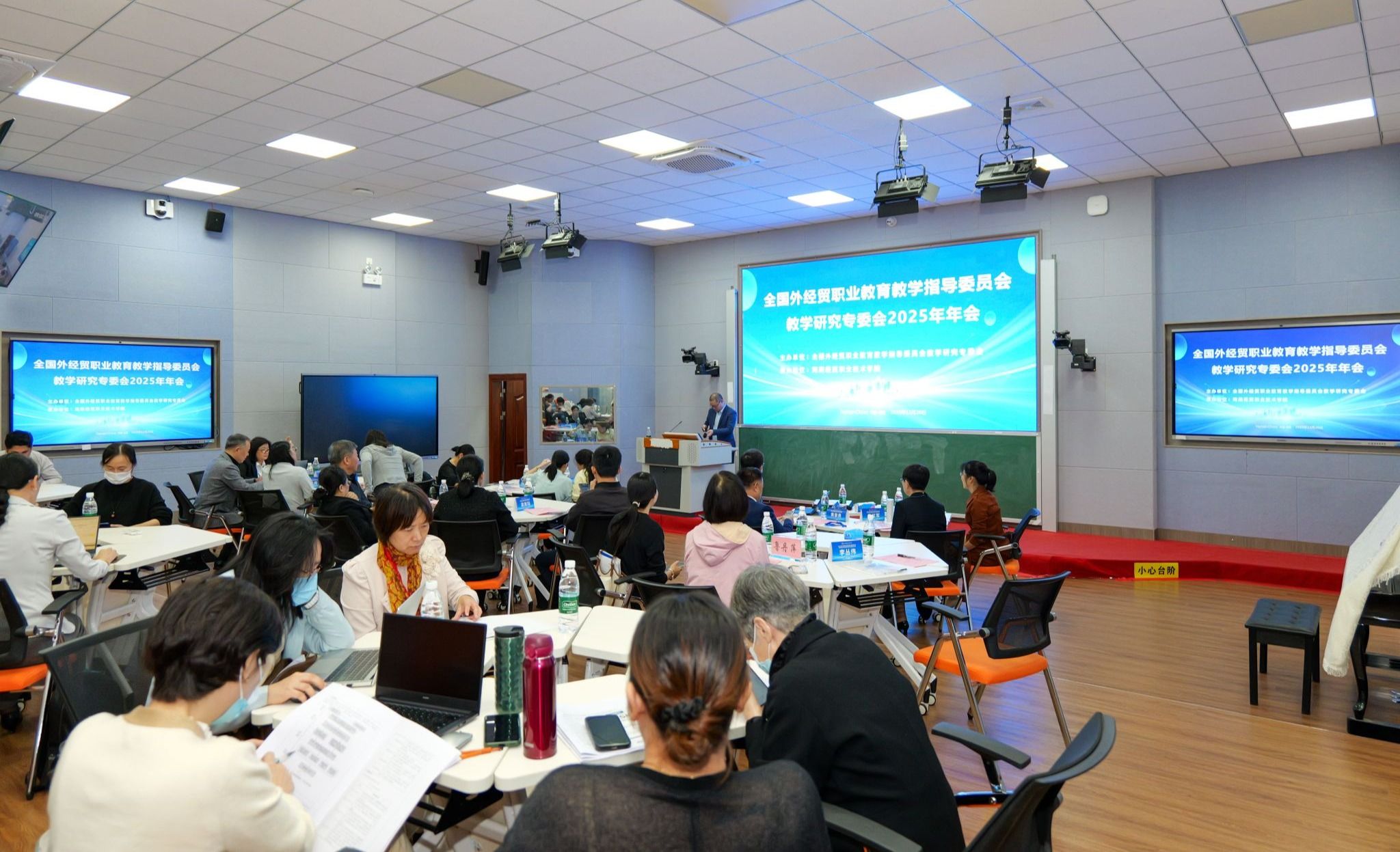 海南经贸职业技术学院副校长杨娜在致辞中表示,期待与各方携手共进,共创职业教育美好未来。全国外经贸行指委教学研究专委会副主任、苏州工业园区服务外包职业学院副校长冯瑞作教学研究专委会2025年度工作汇报。