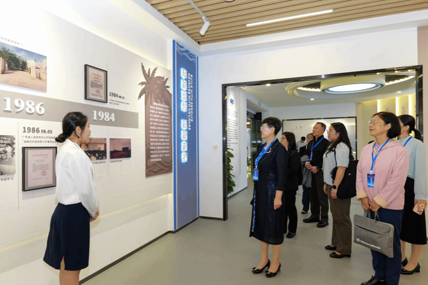 参会人员参观了海南经贸职业技术学院校史展览馆,通过史料、图文与实物展示,全面了解学校发展历程与办学成就。