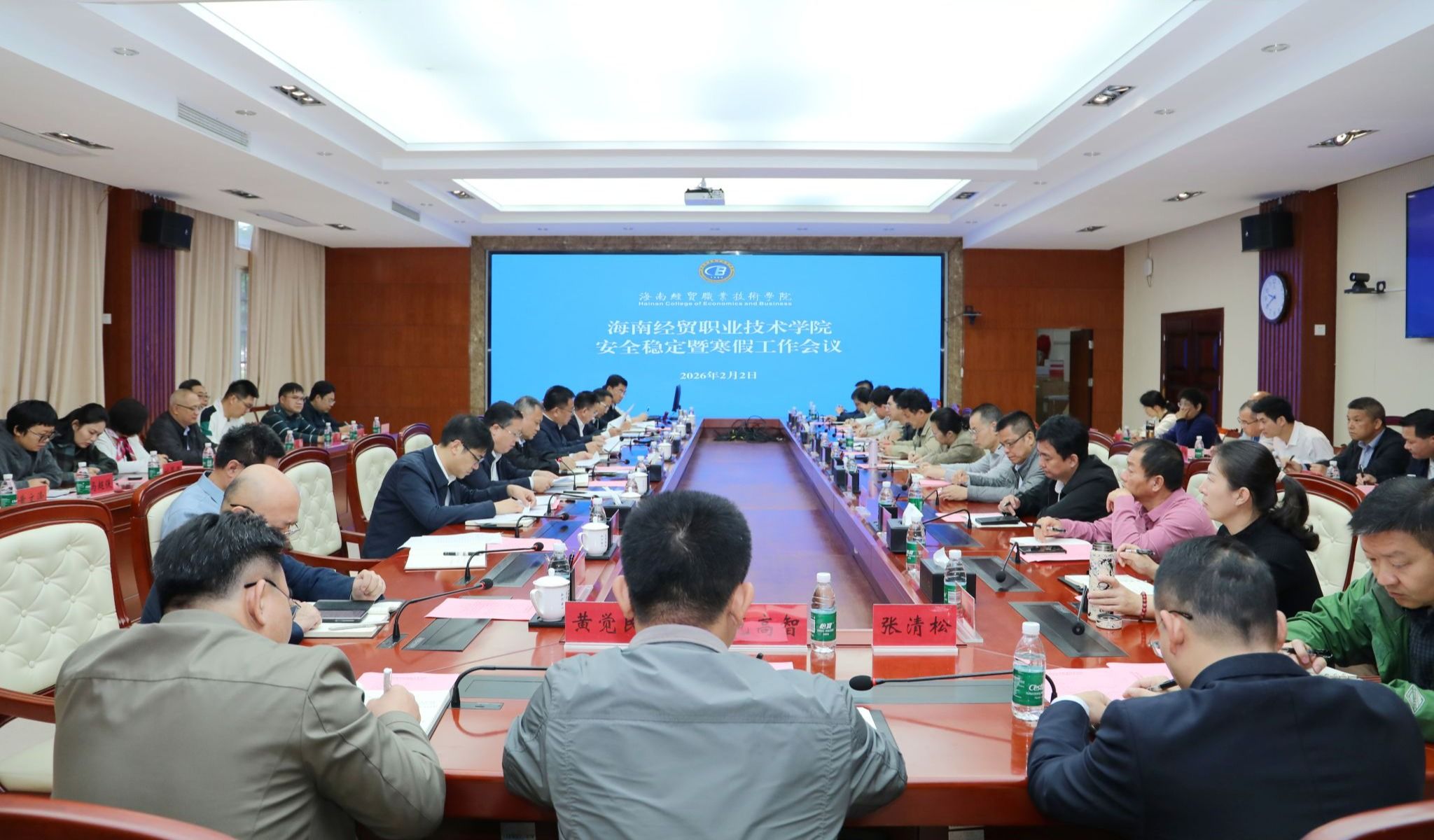 2026年2月2日,海南经贸职业技术学院召开会议,传达学习海南省“两会”精神、安全稳定有关会议和文件精神,部署寒假期间及新学期开学前各项安全稳定和校园管理等重点工作。学校党委书记王华,党委副书记、校长崔昌华,党委委员和校领导符史杭、李厚永、张修志、田小林、方天海出席会议。