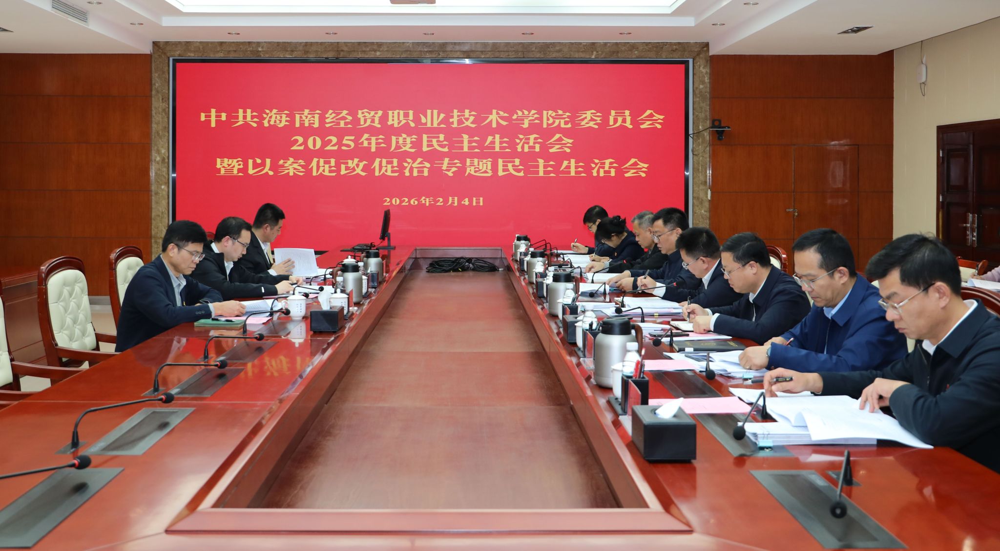 2026年2月4日,海南经贸职业技术学院召开党委2025年度民主生活会暨以案促改促治专题民主生活会。省委组织部干部规划办副主任、一级调研员何为,省纪委监委第三监督检查室一级主任科员彭永龙,省教育厅思想政治教育处一级调研员文强到会指导并作点评讲话。学校党委书记王华,党委副书记、校长崔昌华等学校党政班子成员出席会议。王华主持会议。