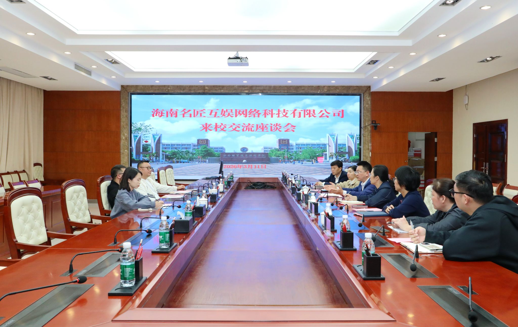 2026年3月11日,海南名匠互娱网络科技有限公司总经理詹欣一行三人来到海南经贸职业技术学院,围绕校企合作事宜进行交流座谈。学校党委副书记、校长崔昌华出席座谈会。