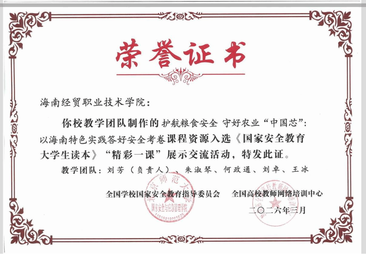 在“4·15”全民国家安全教育日到来之际,海南经贸职业技术学院收到全国学校国家安全教育指导委员会喜讯,由马克思主义学院刘芳老师教学团队制作的“护航粮食安全 守好农业‘中国芯’——以海南特色实践答好安全考卷”课程资源成功入选教育部《国家安全教育大学生读本》“精彩一课”展示交流活动,并在全国高校教师网络培训中心官方网站上线展播,纳入国家级优质教师教育资源库。此次全国共遴选114个优秀教学资源,海经贸是海南省唯一入选的高职院校。