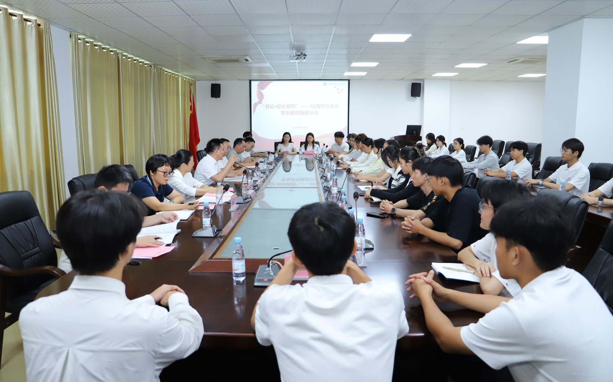 2026年4月23日,正值第31个“世界读书日”。在这个倡导阅读、崇尚知识、启迪思想的美好日子,海南经贸职业技术学院“书记・校长有约”——校领导与青年学生面对面座谈会如期举行。学校党委副书记、校长崔昌华与27名学生代表围坐一堂、坦诚交流,学生工作部(处)、教务处、后勤基建处、招生与就业创业处、团委等部门负责人共同参会,既是对“开卷有益”传统的践行,更是以“读懂青年”的姿态,倾听学生心声、回应成长关切、共话校园发展。