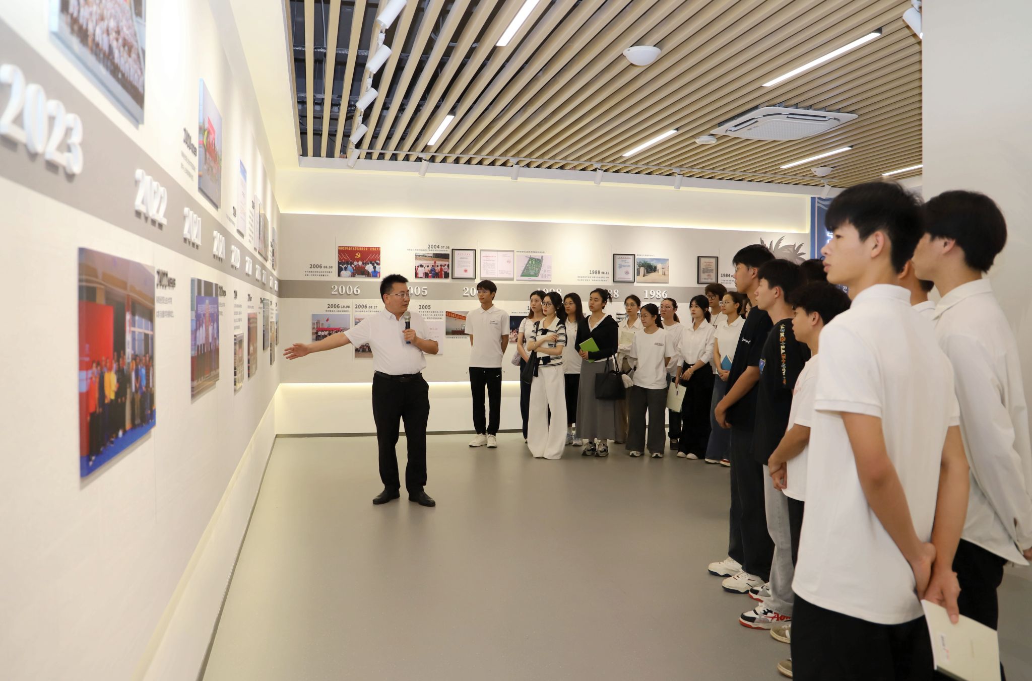 活动伊始,崔昌华带领同学们走进校史展览馆,为大家深情讲述学校四十余年砥砺奋进的办学历程。展厅内,一张张珍贵照片、一项项师生荣誉、一段段发展印记,生动诉说着海经贸的办学初心与辉煌成绩。同学们在历史与现实的交汇中,深刻感悟海经贸精神传承,进一步厚植了爱校、荣校、兴校的真挚情怀。