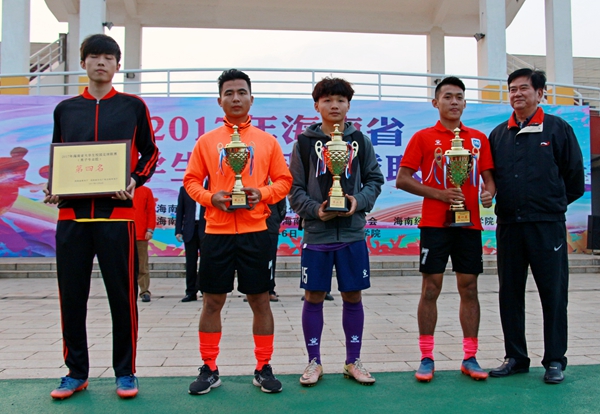 本校12月6日讯(宣传统战部报道)12月5日下午,2017年海南省大学生校园足球联赛结束各项赛程,顺利闭幕。经过5天的激烈角逐,海南经贸职业技术学院男子足球队以4:1、9:1、6:1、4:0的全胜成绩,第8次登上省大足赛普通组冠军宝座。海南大学获得专业组冠军。这两支队伍将代表海南参加中国大学生校园足球联赛(南方赛区)的比赛。