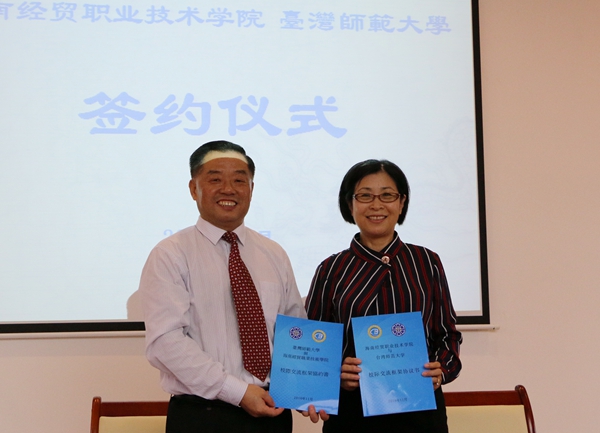 本校11月16日讯(宣传统战部报道)2016年11月16日,参加首届琼台高等职业教育论坛的台湾教育界专家一行在海南省教育厅高教处处长朱双平的陪同下,来到海经贸交流访问。党委书记张继友、院长黄景贵、副书记徐畅,党委委员、组织人事处处长胡友波与台湾客人进行座谈,就开展教师互访交流、教育资源共享、学生短期研修、学术科研合作等方面达成共识。海经贸分别与台湾地区8所高校签订了校际交流框架协议。