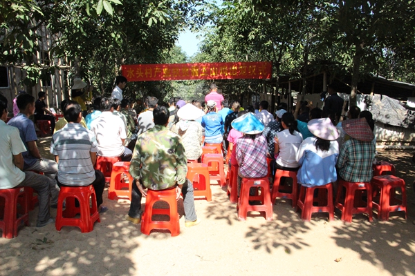 黄景贵代表海经贸向水头村委会转交定点扶贫资金25万元匾牌,向合作社代表转交海经贸教师采购山鸡的收益现金,并向贫困户代表发放一批慰问品。