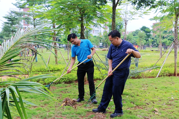 本校9月6日讯(宣传统战部报道)9月6日下午,学校开展校园卫生大扫除活动。校领导张继友书记、黄景贵院长、徐畅副书记和陈修焕副院长亲临现场和老师、同学们一起打扫清洁卫生,为巩固提升海口创建全国文明城市和创建国家卫生城市的成果而助力加油。
