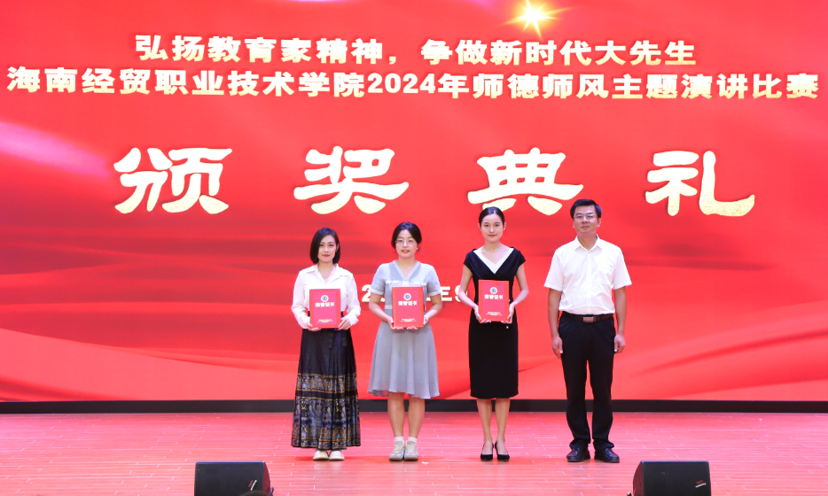 2024年9月27日,海南经贸职业技术学院举行“弘扬教育家精神、争做新时代大先生”师德师风主题演讲比赛,引导广大教育工作者大力弘扬教育家精神,树立“躬耕教坛、强国有我”的志向和抱负,努力成为塑造学生品格品行品位的大先生。张又文、曲文晗老师荣获一等奖。