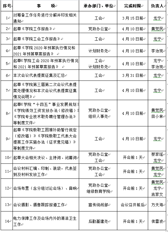 学院第三届教职工暨工会会员代表大会第三次会议(以下简称“两代会”)定于2021年4月份召开。为做好本次大会筹备工作,确保大会的顺利召开,现将“两代会”第三次会议筹备工作任务分工通知如下。