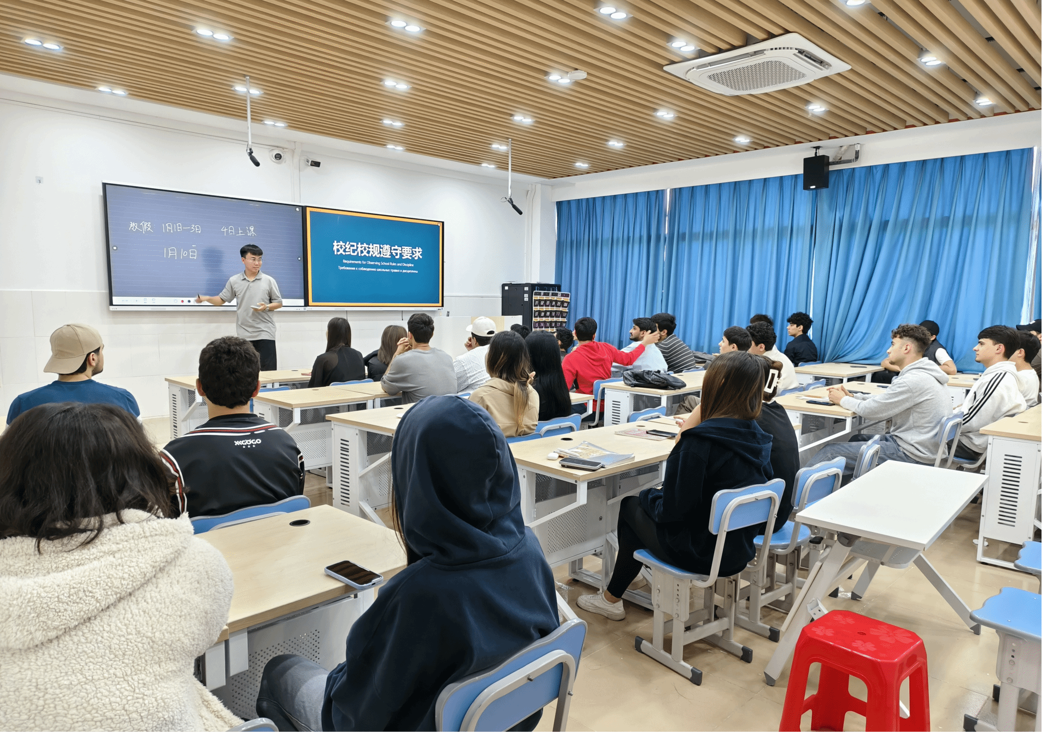 会议详细解读学校考试管理规定及违纪作弊处理办法,着重强调诚信考试的重要意义,引导国际学生深刻认识考试作弊的严重后果,牢固树立“诚信应考”理念。针对学生在考勤纪律、宿舍安全规范、同学交往礼仪等方面存在的薄弱环节,结合典型案例开展深入剖析,明确指出违规行为的潜在风险与不良后果,引导学生正视问题并整改。