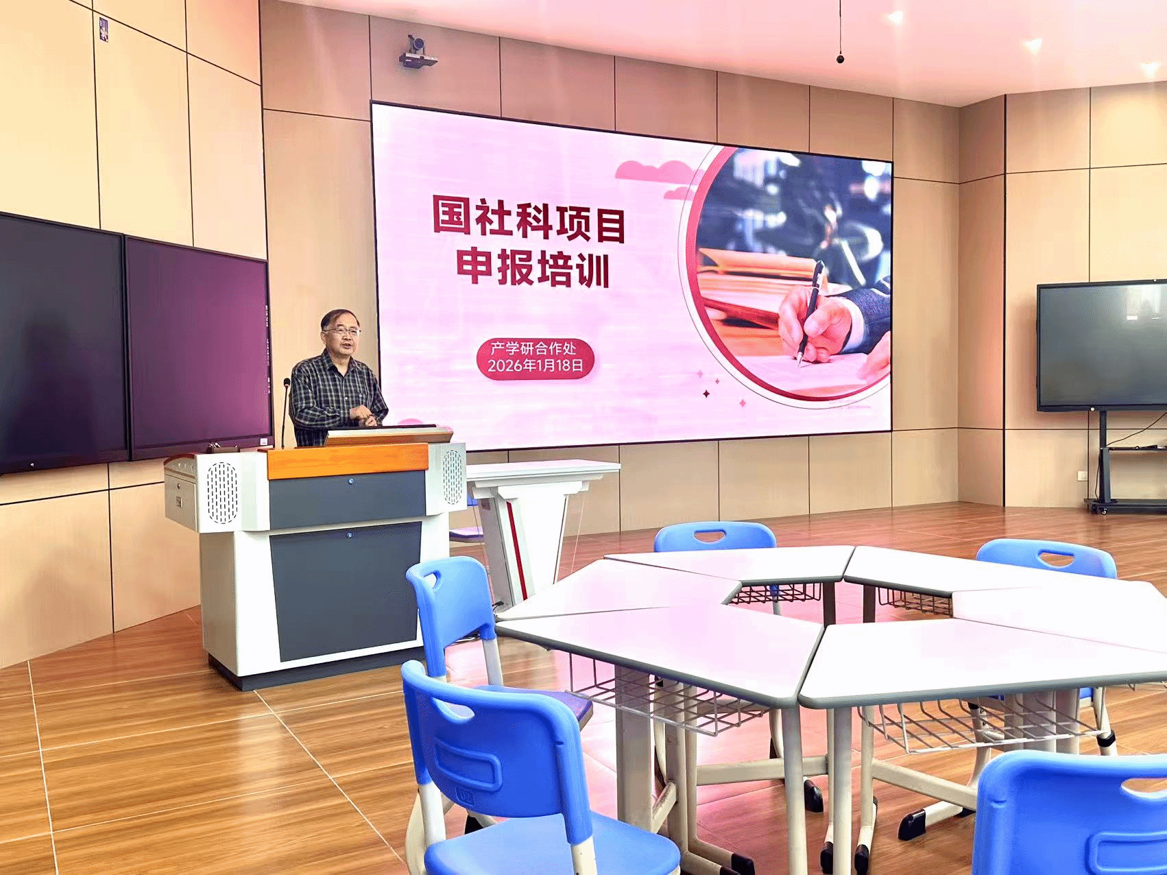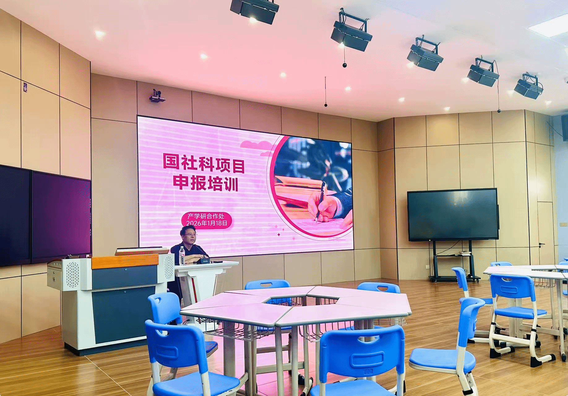 2026年1月19日,产学研合作处抢抓国家社会科学基金项目申报关键期,组织专题培训会,着力提升科研项目申报质量与立项成功率。兰州大学二级教授、博士生导师王学俭,东北大学二级教授、博士生导师田鹏颖来校主讲,各二级学院科研申报骨干及青年教师代表参会,共探申报技巧、破解科研难题。