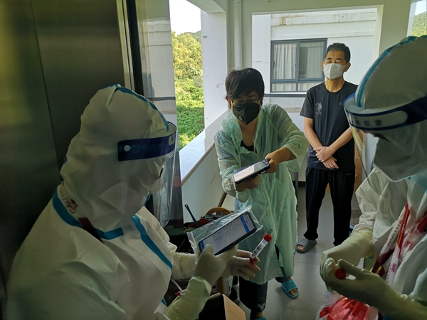 在陵水县港坡村核酸检测点,黄银亮正耐心地帮助当地村民输入信息、核实身份。港坡村村民以老人和留守儿童为主,多数人没有智能手机,只能提供身份证或户口本,甚至是一张写着身份证号码的纸条,核酸检测的信息就靠志愿者手动输入。既要准确,又要快捷,避免让村民排队时间太久,黄银亮干脆把原本用来防止手机沾上病毒的塑料袋扯了下来。港坡村有将近2000名村民,不到3个小时就全部完成核酸检测了。“当地村委会组织得力,村民非常配合,从湖北来的医务人员经验丰富,让这项工作完成得非常顺利”,黄银亮说。