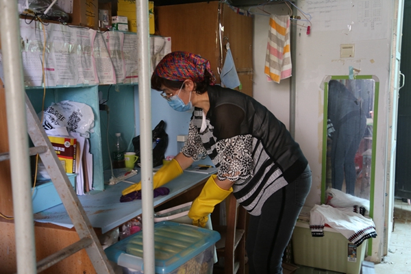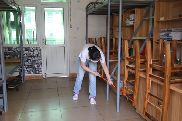 开窗通风透气,整理归置物品,扫地抹桌子、清扫垃圾……在36℃的高温天气下,老师们撸起袖子,或者一人包干数间宿舍,或者组成小组搭配干活,有的在擦洗漱台,有的在拖地,有的在清理垃圾,干得热火朝天、汗流浃背。清理过后,全校2230间宿舍的书桌物品摆放整整齐齐,床、柜、桌、椅和地面都被擦拭得干干净净,发霉变质的食物、空饮料瓶等垃圾被清理丢弃。