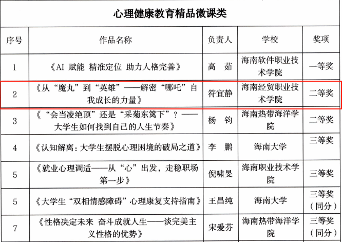 近日,2025年全省高校心理育人“五个一批”系列评选活动获奖作品公布。海南经贸职业技术学院选送的作品《认知行为疗法在一例大学生强迫障碍案例中的应用》《从“魔丸”到“英雄”——解密“哪吒”自我成长的力量》《青绿千载山河无垠——情绪修复的东方美学实践》《正视危机 珍爱生命》分别获得心理健康教育指导案例类、微课类、教案类二等奖;《破局 ·赋能 ·蝶变:大学生心理韧性与就业能力双向突破实践案例》获得案例类三等奖。海南经贸职业技术学院荣获“优秀组织单位奖”。