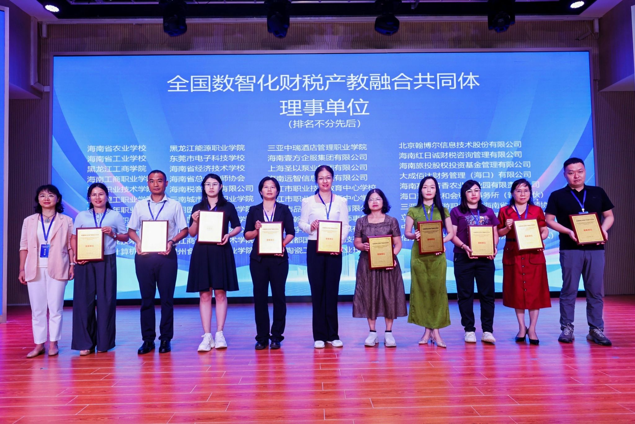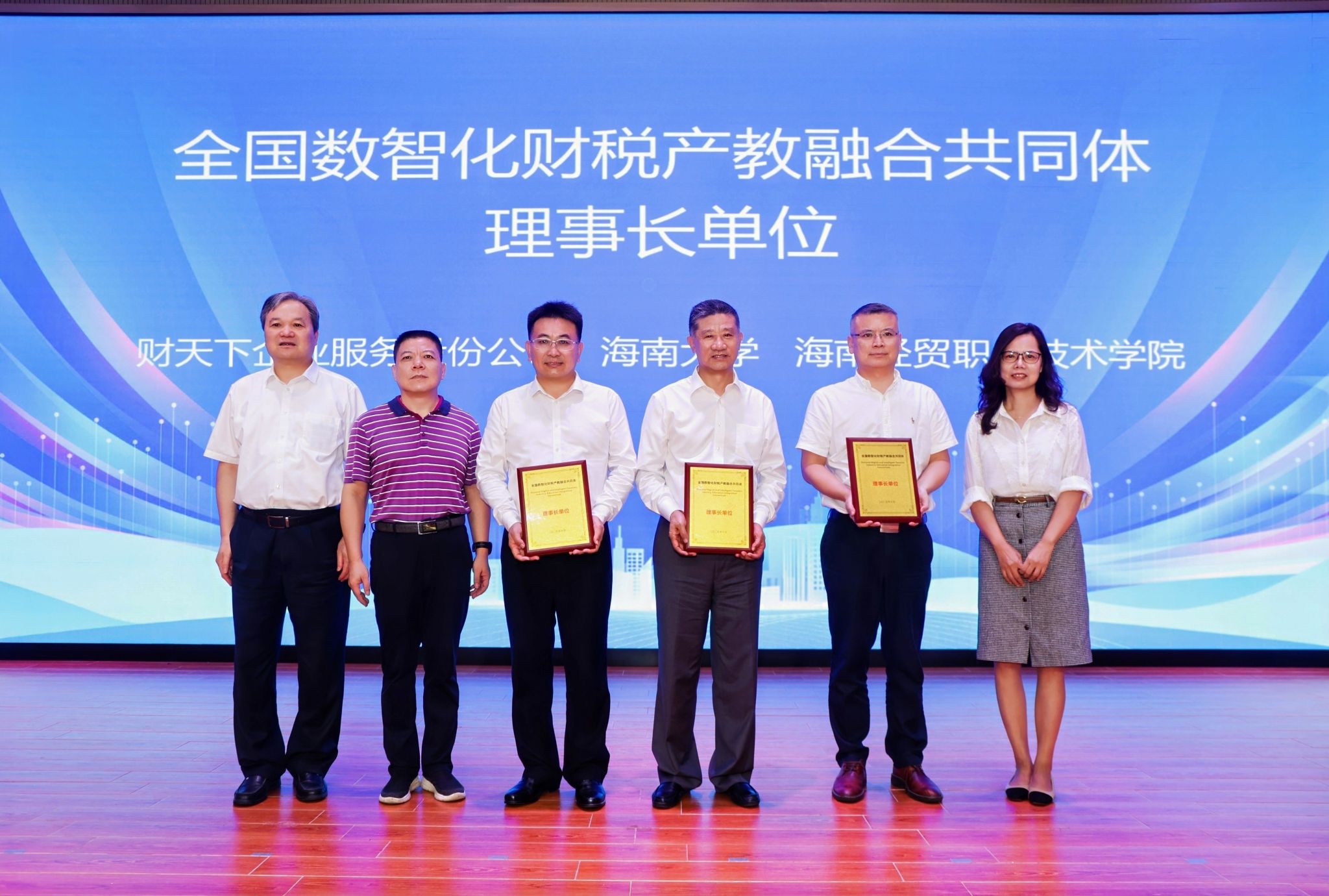 在热烈的掌声中,领导嘉宾共同上台,一起按下启动键,全国数智化财税产教融合共同体正式成立。财天下企业服务股份公司、海南大学、海南经贸职业技术学院为共同体理事长单位。大会为理事长单位、常务副理事长单位、副理事长单位、常务理事单位、理事单位颁发证书,并为共同体的首个重要成果“海南省财税科普基地”授牌。