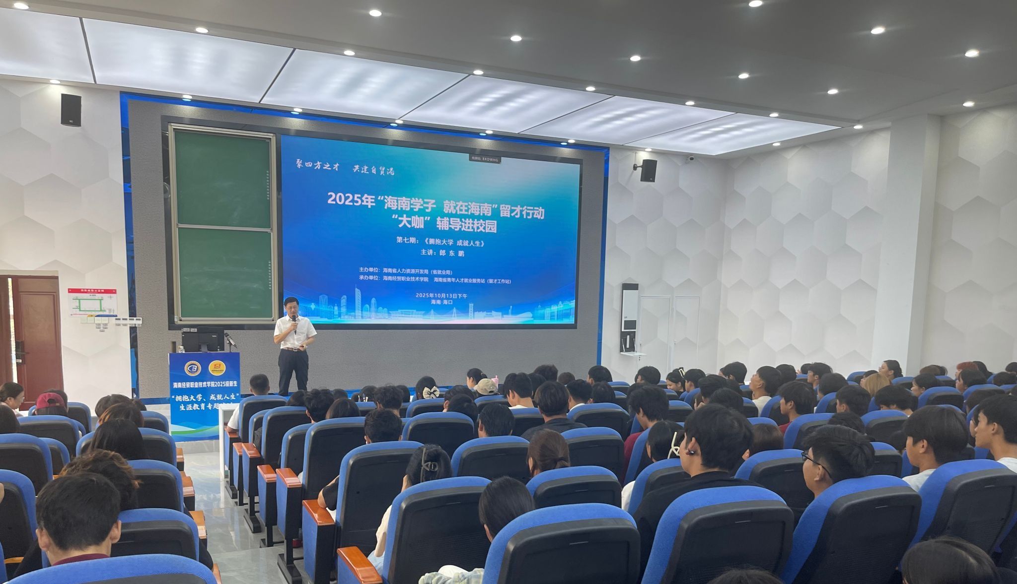 郎东鹏围绕“大学生涯三问”“大学生涯的八个主题”等内容进行系统讲解。他结合多年生涯教育研究经验与典型案例,深入浅出地解析职业发展逻辑。“职业不仅是谋生手段,更是实现人生价值的核心载体。确立人生目标后,需以职业为锚点,精准匹配自身能力与岗位需求,在创造社会价值的过程中实现自我超越。”他鼓励同学们,要充分依托海经贸的专业优势,紧盯海南自贸港特色产业布局,提前规划职业路径,将个人成长轨迹与自贸港建设的时代机遇深度融合。