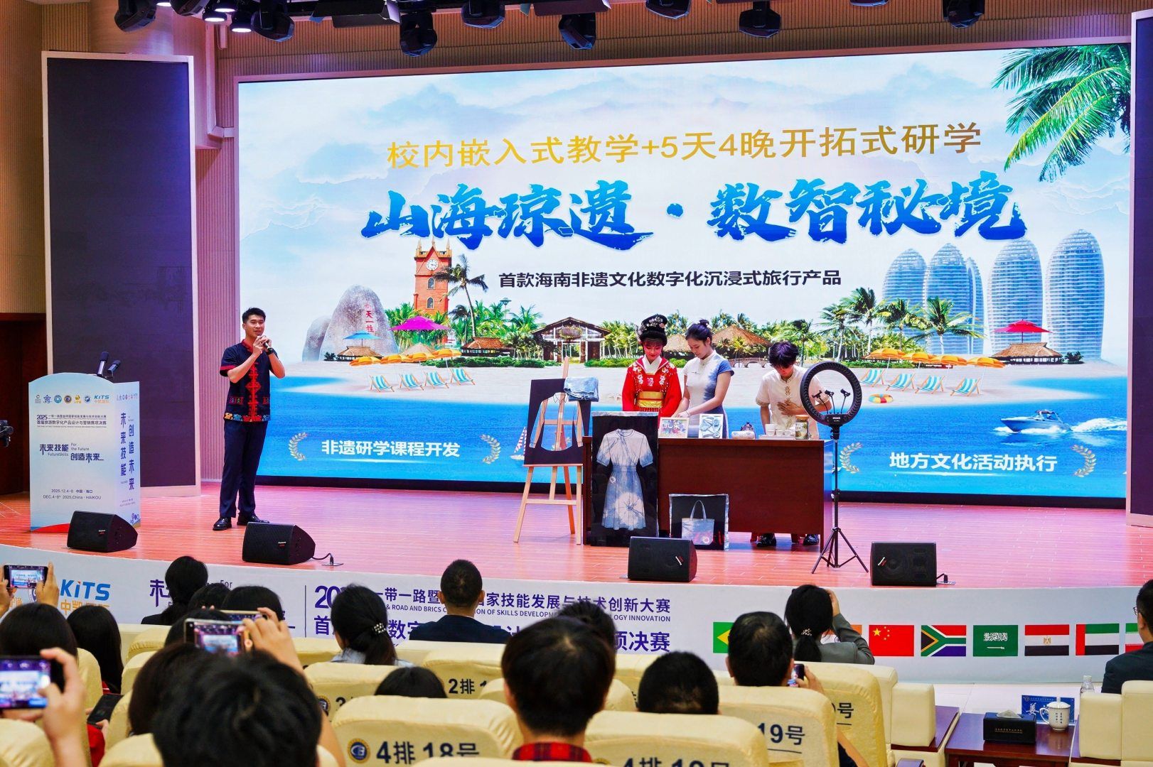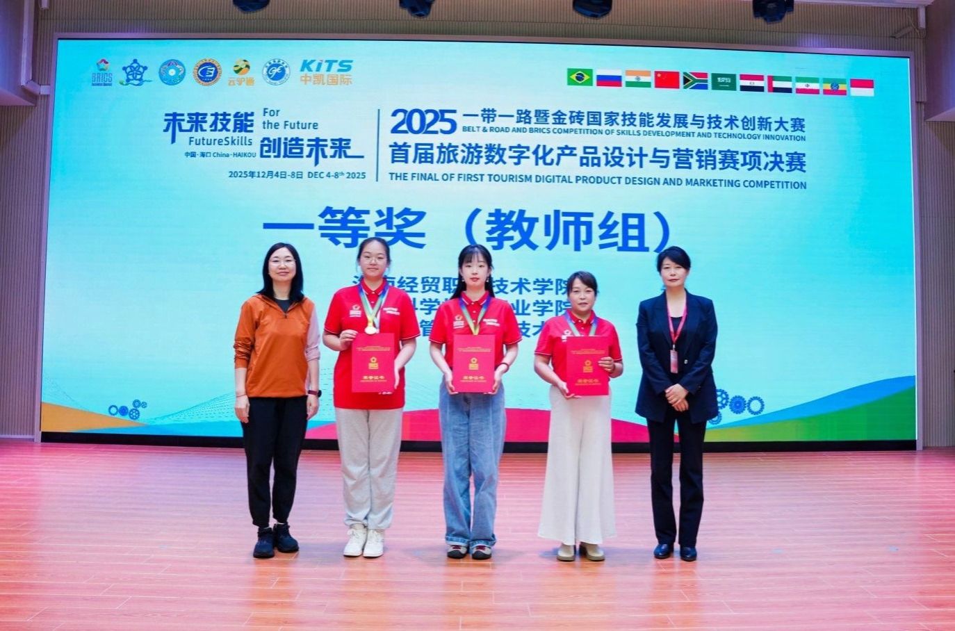 2025年12月5日-7日,一带一路暨金砖国家技能发展与技术创新大赛首届旅游数字化产品设计与营销赛项全国总决赛在海南经贸职业技术学院顺利举行。全国66支优秀参赛队伍齐聚海口,以数字技术为笔、以文旅创意为墨,在椰城上演一场“数字+旅游”的技能盛宴。海南经贸职业技术学院在本次比赛中荣获职教组和教师组两个一等奖。