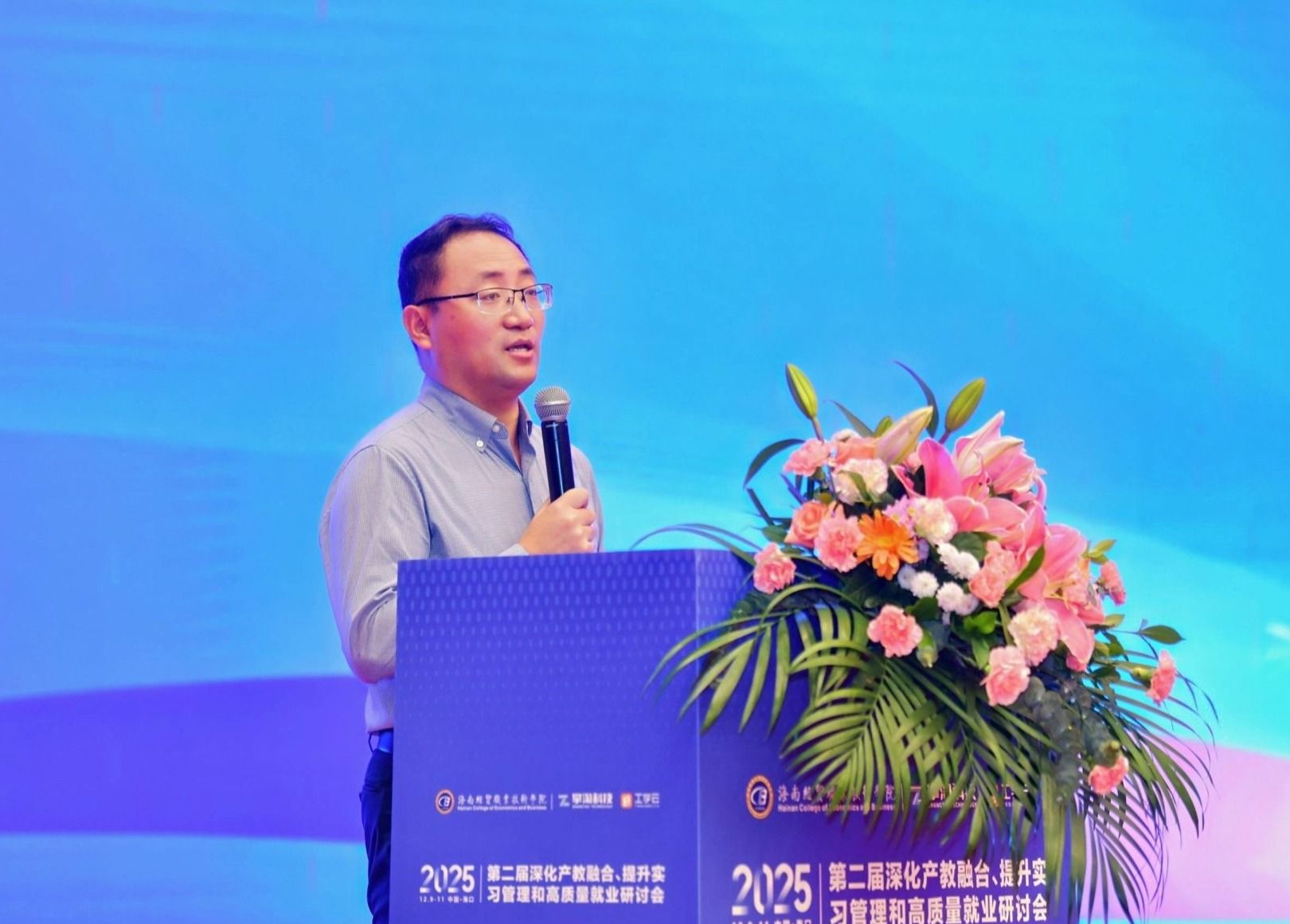 王华对各位来宾的到来表示热烈欢迎。他说,海南经贸职业技术学院是海南省唯一的财经商贸类高职院校,始终坚持以服务海南“45432”现代化产业体系为导向,将深化产教融合、校企合作作为办学治校的基本路径。他期待本次研讨会聚焦“机制创新”,共探产教深度融合新路径;聚焦“过程赋能”,共谋实习管理提质新范式;聚焦“供需匹配”,共筑高质量就业新生态,为新时代职业教育改革发展注入新的思想动力。