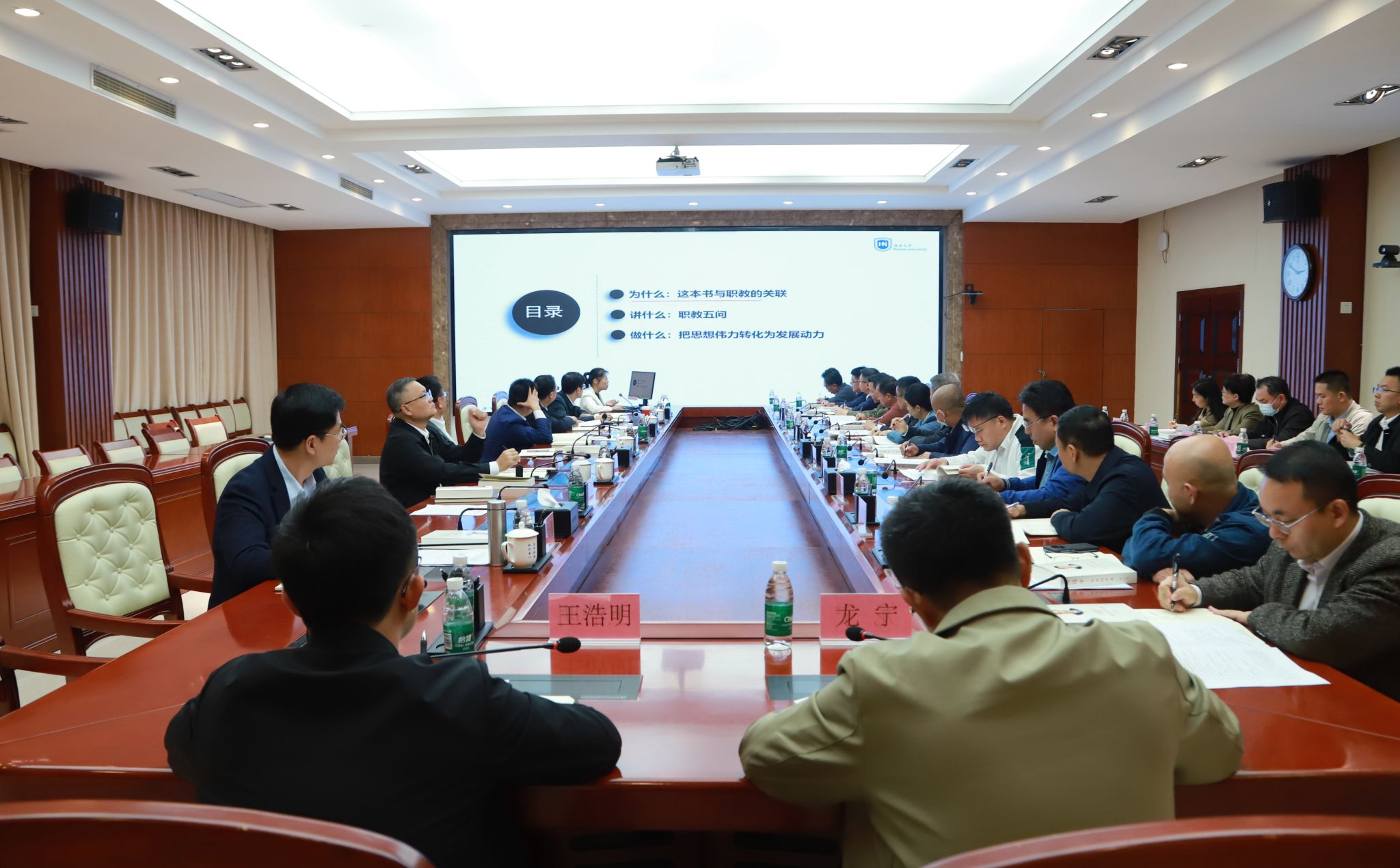 王华说,要进一步融会贯通学习,深刻感悟“思想伟力”,真正把理论知识学深悟透、入脑入心,把学习成果转化为发展动能。他强调,海南自贸港全岛封关运作启动在即,学校要牢牢把握这一时代机遇,找准发展方向,保持战略定力,紧扣海南经济社会发展与产业布局需求,科学谋划 “十五五” 发展规划,下好事业发展“先手棋”。一要把牢政治方向,持之以恒学习,增强 “四个意识”、坚定 “四个自信”、做到 “两个维护” ,不断提高政治判断力、政治领悟力、政治执行力。二要有“舍我其谁”的担当,勇担时代使命,在服务学校发展中挑大梁、扛重任。三要发扬“率先垂范”的拼搏精神,廉洁奉公、勇于自我革新,坚决摒弃“躺平”心态,以实干精神破解办学治校中的难点堵点问题,奋力开创学校高质量发展新局面。
