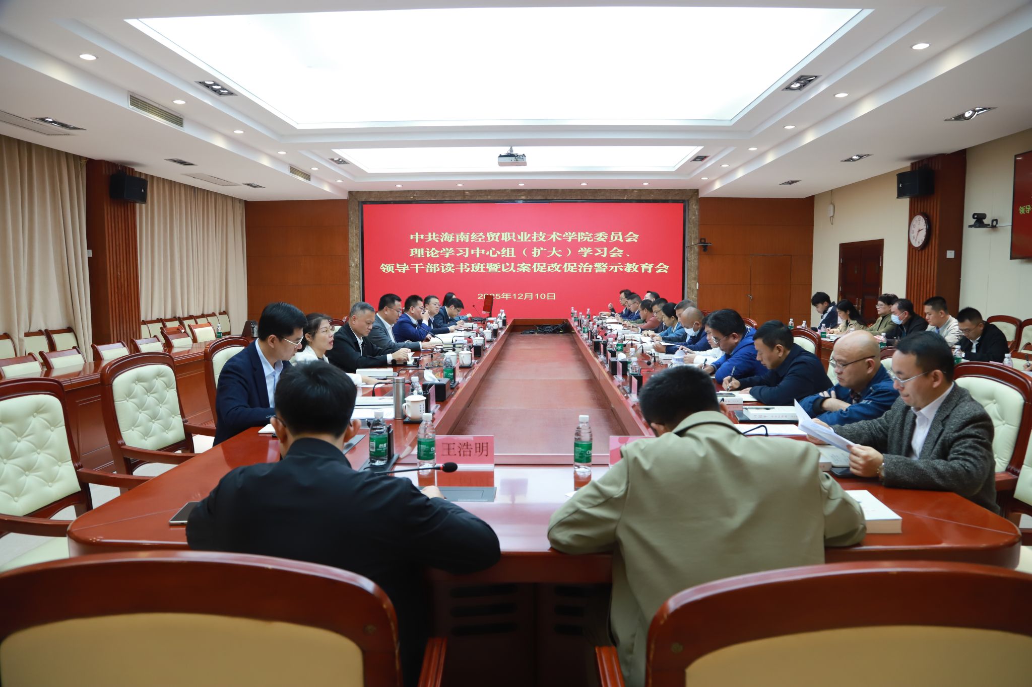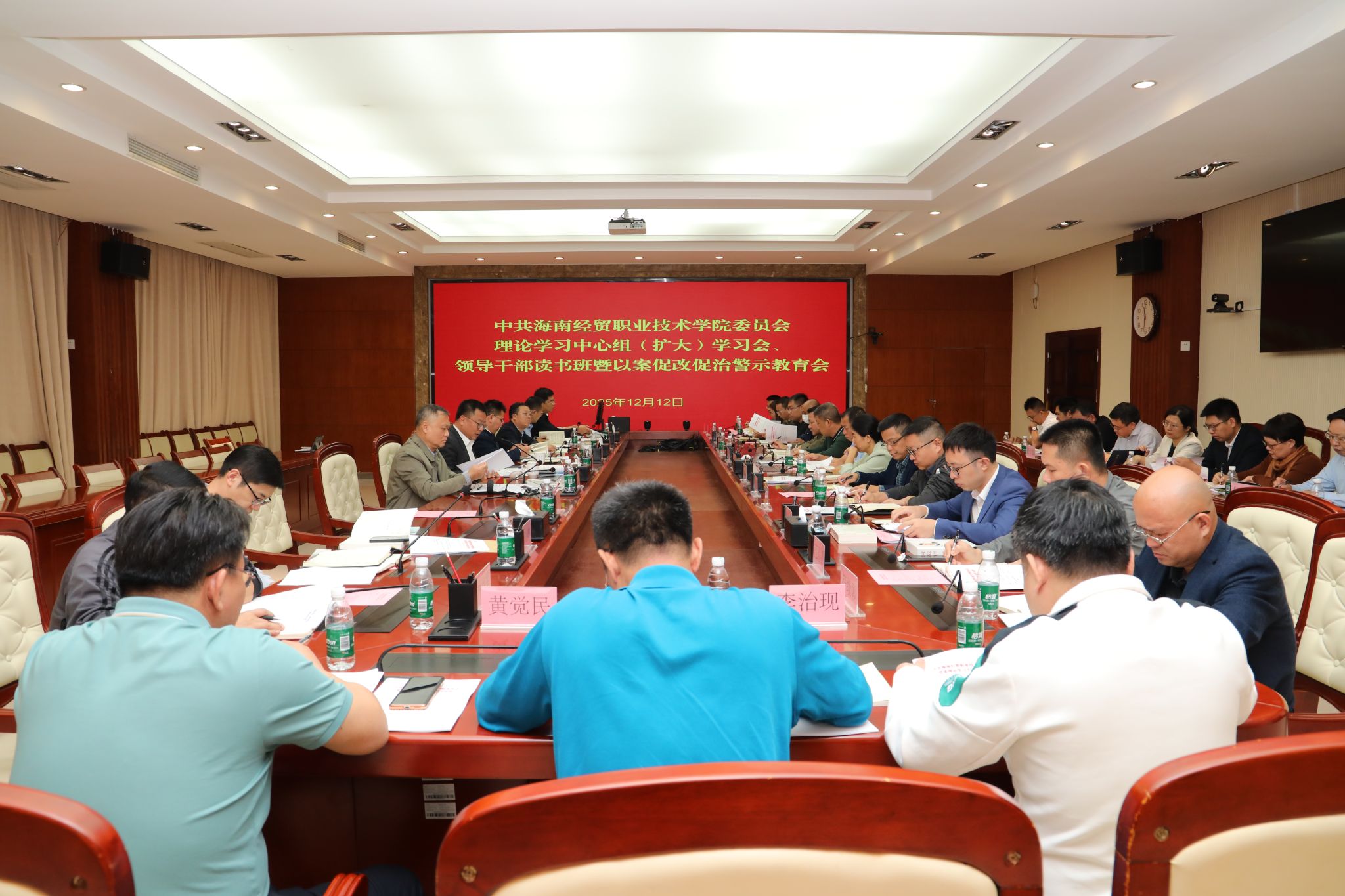 2025年12月10日-12日,海南经贸职业技术学院举办党委理论学习中心组(扩大)学习会、领导干部读书班暨以案促改促治警示教育会,以专题辅导、现场考察、个人自学、观看视频、集中学习与专题研讨等方式,认真学习贯彻《习近平谈治国理政》第五卷、党的二十届四中全会精神、习近平总书记听取海南自由贸易港建设工作汇报时的重要讲话精神、省委八届八次全会精神和省委有关以案促改促治工作要求。学校党政班子成员参加学习。