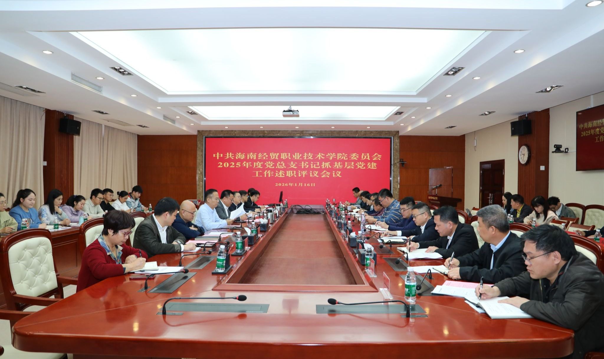 2026年1月16日,海南经贸职业技术学院召开2025年度党总支书记抓基层党建工作述职评议考核会。学校党委书记王华,党委委员、副校长李厚永,党委委员、副校长张修志,党委委员田小林出席会议。王华主持会议。
