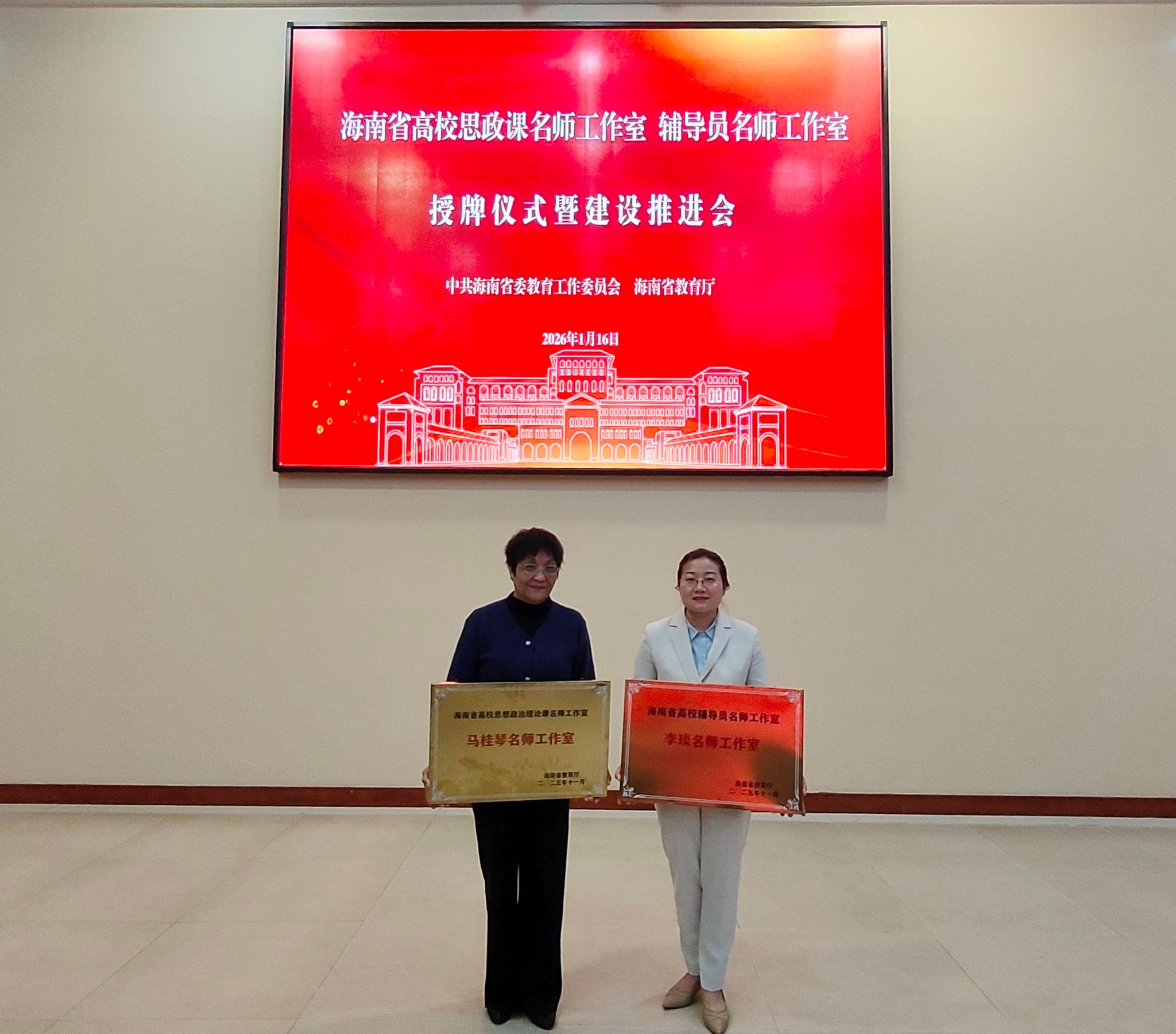 2026年1月16日,海南省高校思政课名师工作室、辅导员名师工作室授牌仪式暨建设推进会在海南大学举行。海南经贸职业技术学院马克思主义学院院长马桂琴主持的“匠心育人”工作室,入选海南省高校思想政治理论课名师工作室;财务管理学院党总支副书记李琰主持的“红匠”工作室,入选海南省高校辅导员名师工作室。