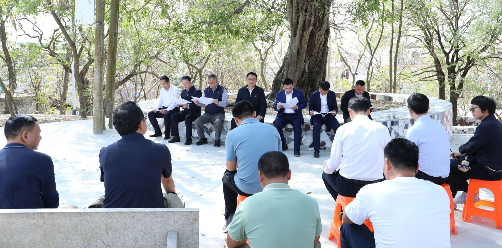在休闲园的大榕树下,学校党委班子成员、昌江县、石碌镇及水头村相关干部围坐一堂,听取学校驻水头村“第一书记”汇报2025年工作情况,专题研讨水头村2026年乡村振兴工作计划与具体举措。与会领导与村干部各抒己见、集思广益,围绕人居环境改善、乡村治理提质、教育精准帮扶、特色品牌打造、技术赋能农业、帮扶工作提质增效等方面,提出针对性建议和工作设想,精准锚定帮扶发展方向,细化各项工作落地举措。王华强调,帮扶工作要久久为功、善作善成,既要系统总结帮扶工作中的好经验、好做法,更要用心打造海经贸乡村振兴特色品牌,以实打实的举措提升帮扶实效,为水头村留下带不走的发展动能、可持续的振兴成果。