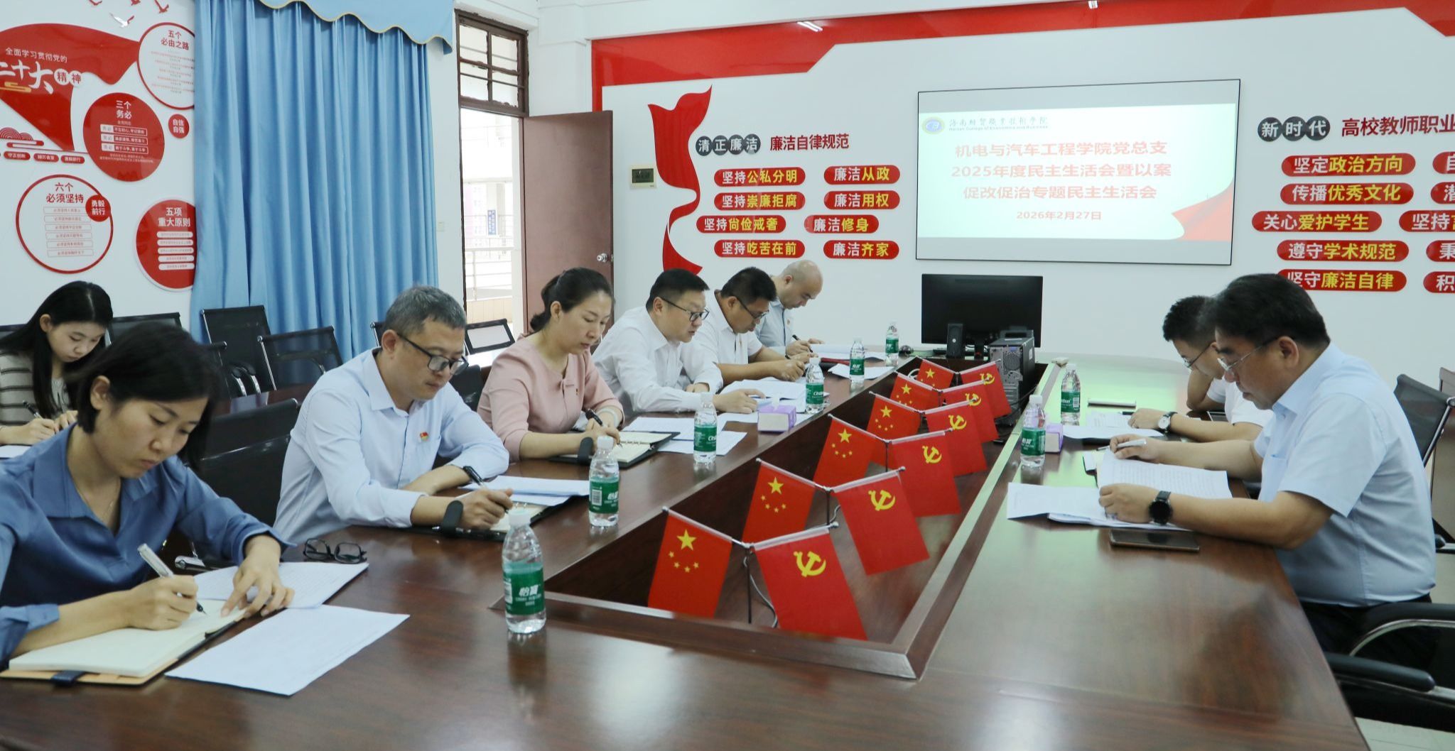 近期,海南经贸职业技术学院各党总支按照学校党委统一部署,相继召开2025年度民主生活会暨以案促改促治专题民主生活会。学校党委高度重视,党委书记王华,党委副书记、校长崔昌华和其他党政领导班子成员与督导组成员一道,分别深入各党总支民主生活会并全程列席指导。
