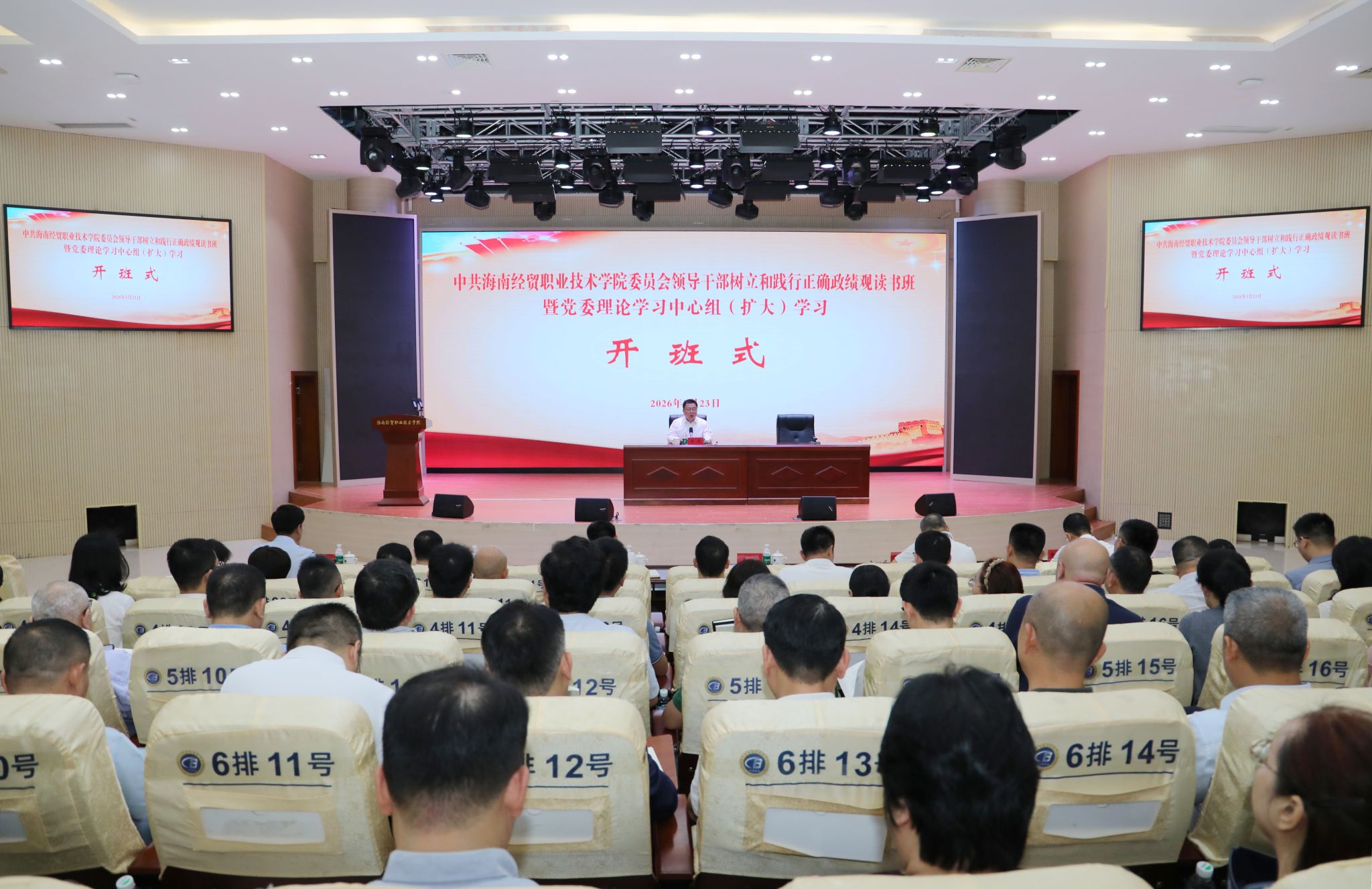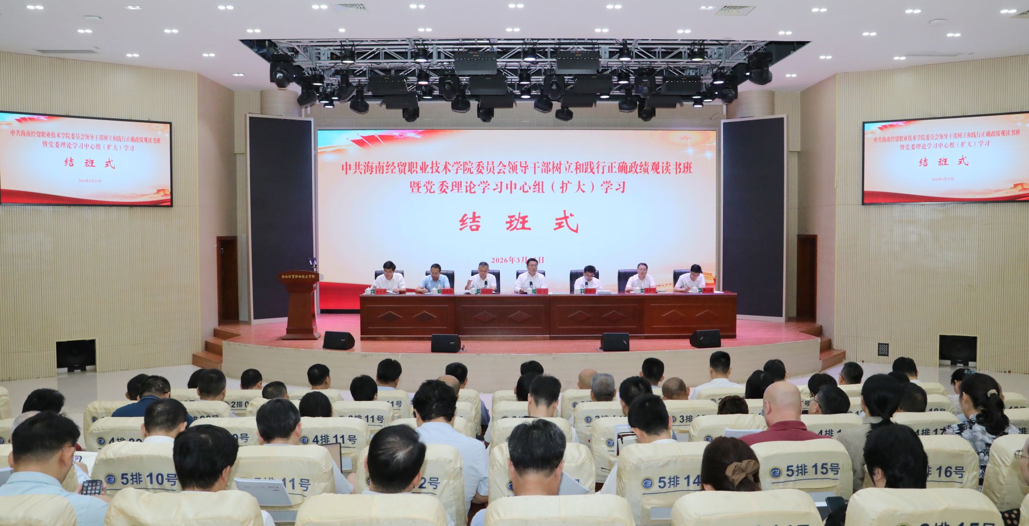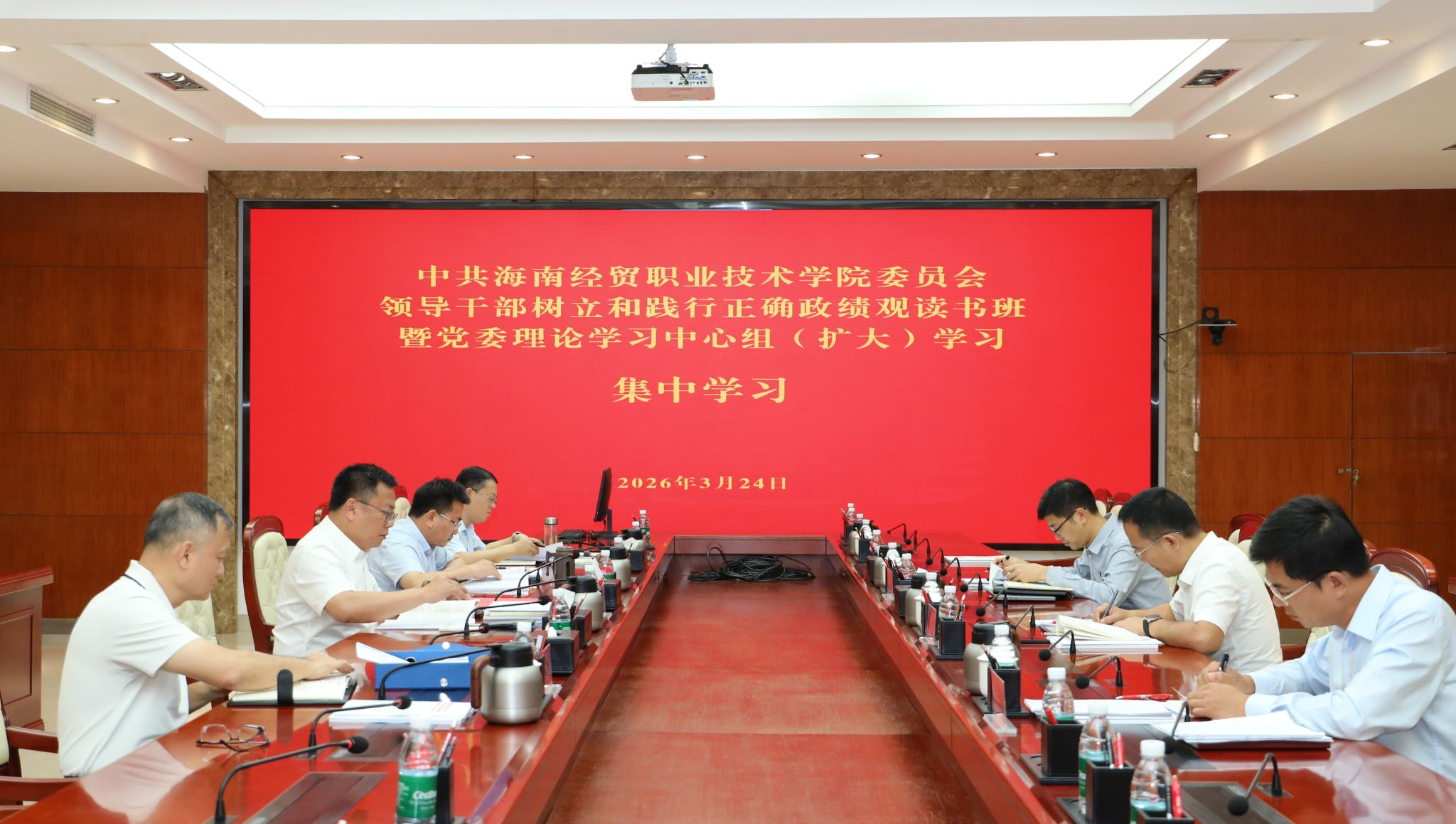 2026年3月23日至25日,海南经贸职业技术学院举行领导干部树立和践行正确政绩观读书班暨党委理论学习中心组(扩大)学习会,深入学习领会习近平总书记关于树立和践行正确政绩观的重要论述,深入学习习近平总书记在党的二十届四中全会、中央经济工作会议、二十届中央纪委五次全会、省部级主要领导干部学习贯彻党的二十届四中全会精神专题研讨班上的重要讲话精神,习近平总书记关于海南工作的重要讲话和指示批示精神,国家、海南“十五五”规划和学习教育有关文件精神,教育引导全校党员干部切实将正确政绩观内化于心、外化于行,用实绩实效践行对党绝对忠诚。