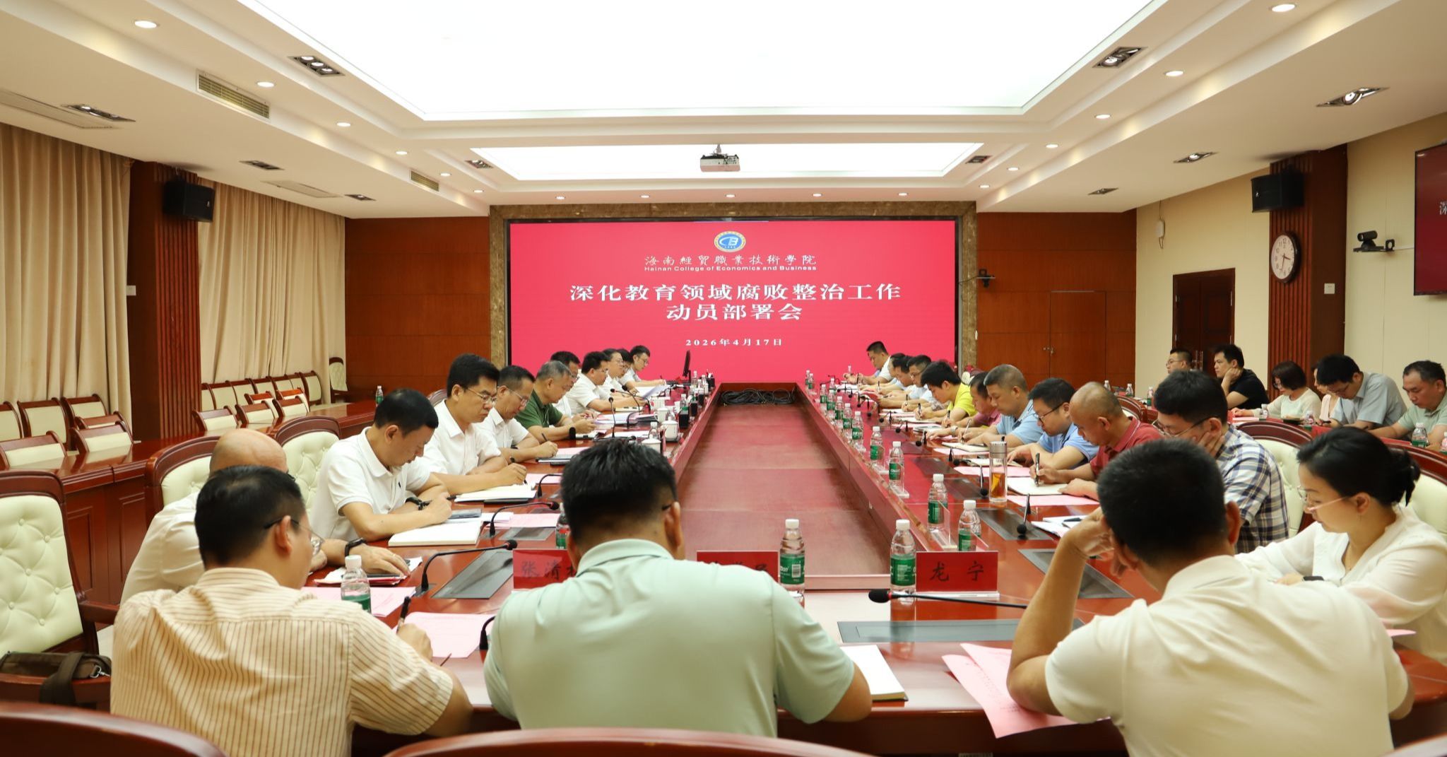 2026年4月17日,海南经贸职业技术学院召开深化教育领域腐败整治工作动员部署会。党委书记王华作动员讲话,学校党委班子成员出席会议。