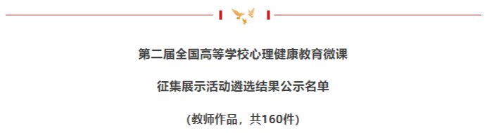 本次活动由教育部思想政治工作司指导、普通高等学校学生心理健康教育专家指导委员会主办、中国大学生在线承办,面向全国高校广泛征集微课作品,共收到各类参赛作品2806件。经初评、复评、终评及政审等多轮严格评审,最终遴选出160件优秀教师作品、80件优秀学生作品。