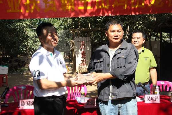 黄景贵代表海经贸向水头村委会转交定点扶贫资金25万元匾牌,向合作社代表转交海经贸教师采购山鸡的收益现金,并向贫困户代表发放一批慰问品。