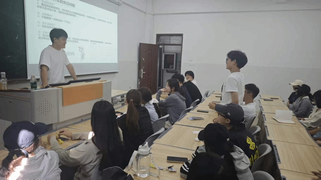 在互动答疑环节,同学们围绕跨专业报考、备考资料选择、心态调整、报班建议等问题踊跃提问,辅导员老师与刘浩鹏同学耐心逐一解答,结合政策要求与实战经验给出针对性建议,有效消除了同学们的备考困惑,让大家对专升本考试与复习规划有了更全面、清晰的认知。