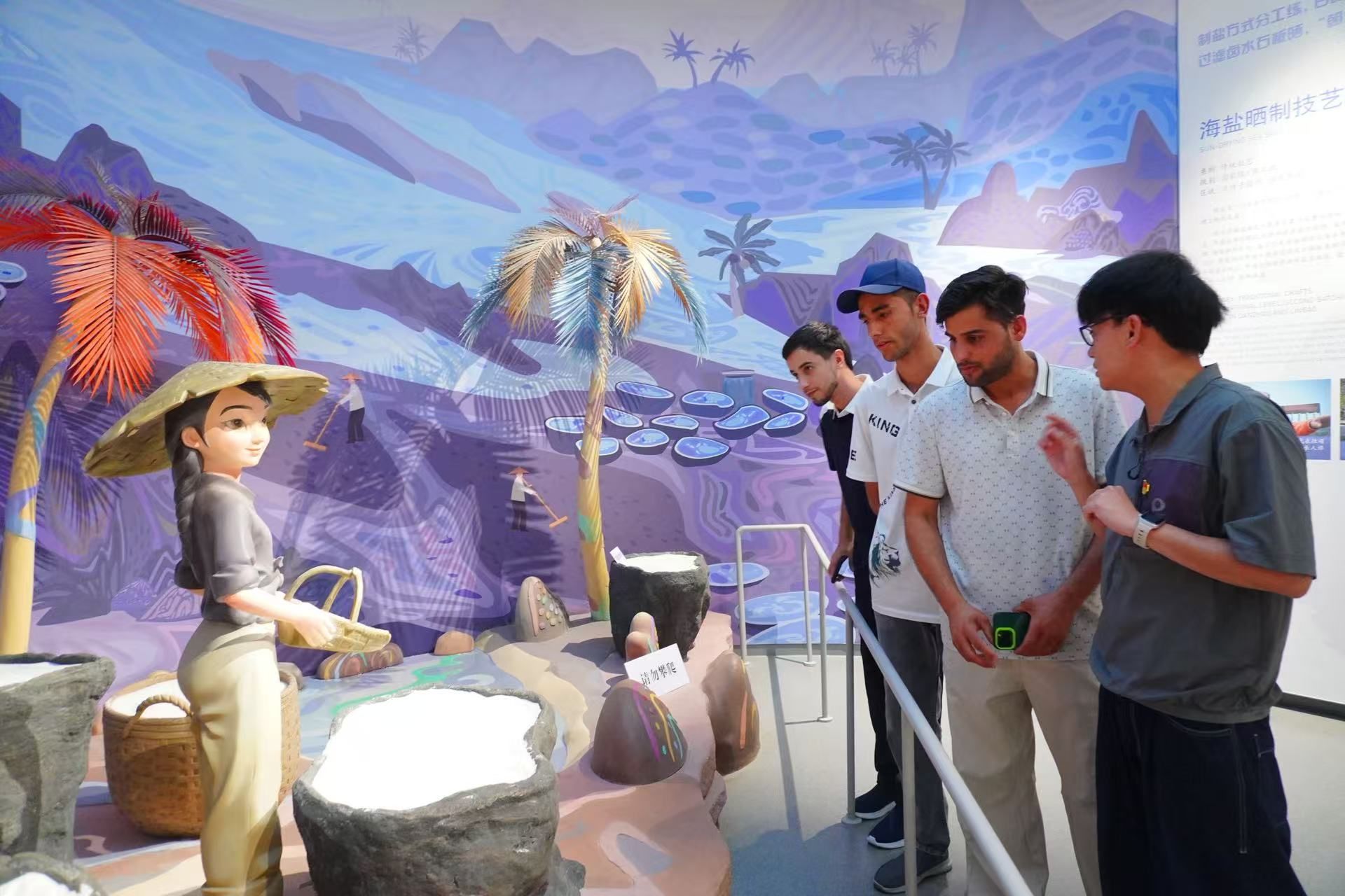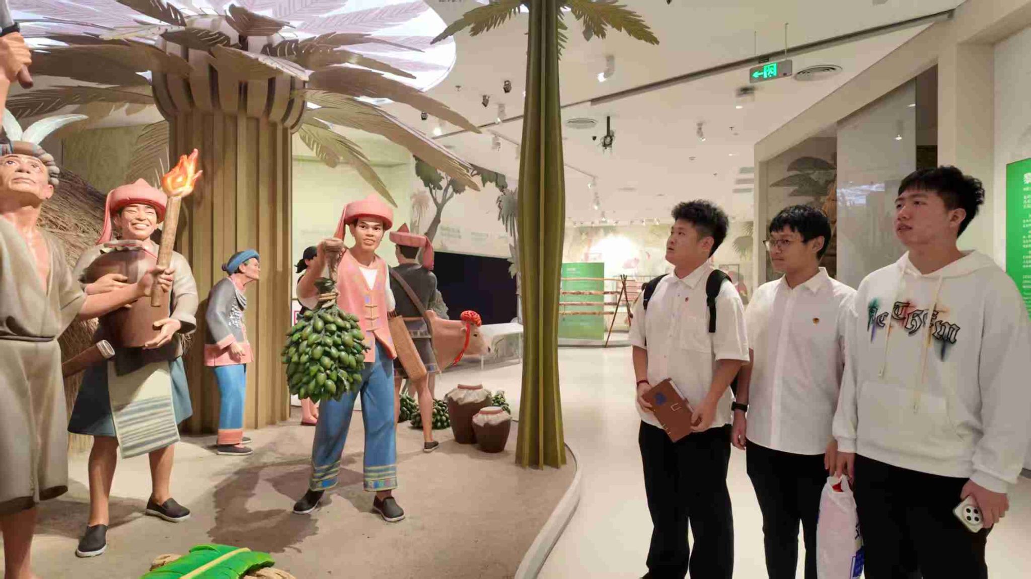 在海南非遗文化展示中心,师生们跟随讲解员的脚步,沉浸式领略黎锦、椰雕、琼剧等海南特色非遗项目的独特魅力。作为海南文化的鲜活载体,黎锦承载着3000余年的黎族民俗底蕴,椰雕凭借精湛工艺享有“天南贡品”美誉,琼剧则以婉转唱腔传递琼岛风情,这些非遗技艺共同构成了海南文化的精神密码。从精美的黎锦纹样到古朴的琼剧服饰,从生动的民俗场景复原到互动式非遗体验,每一处细节都在诉说海南文脉的源远流长和深厚底蕴。