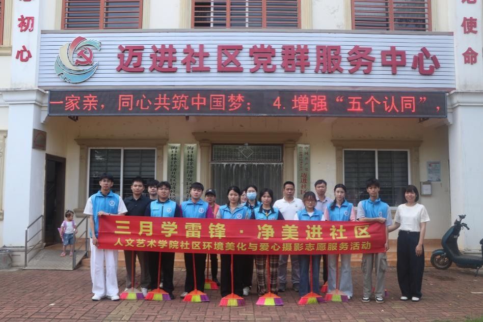 为深入弘扬雷锋精神,传递文明新风,2026年3月26日,人文艺术学院志愿者队伍来到海口市美兰区迈进社区,开展 “三月学雷锋・净美进社区”暨社区环境美化与爱心摄影志愿服务活动。