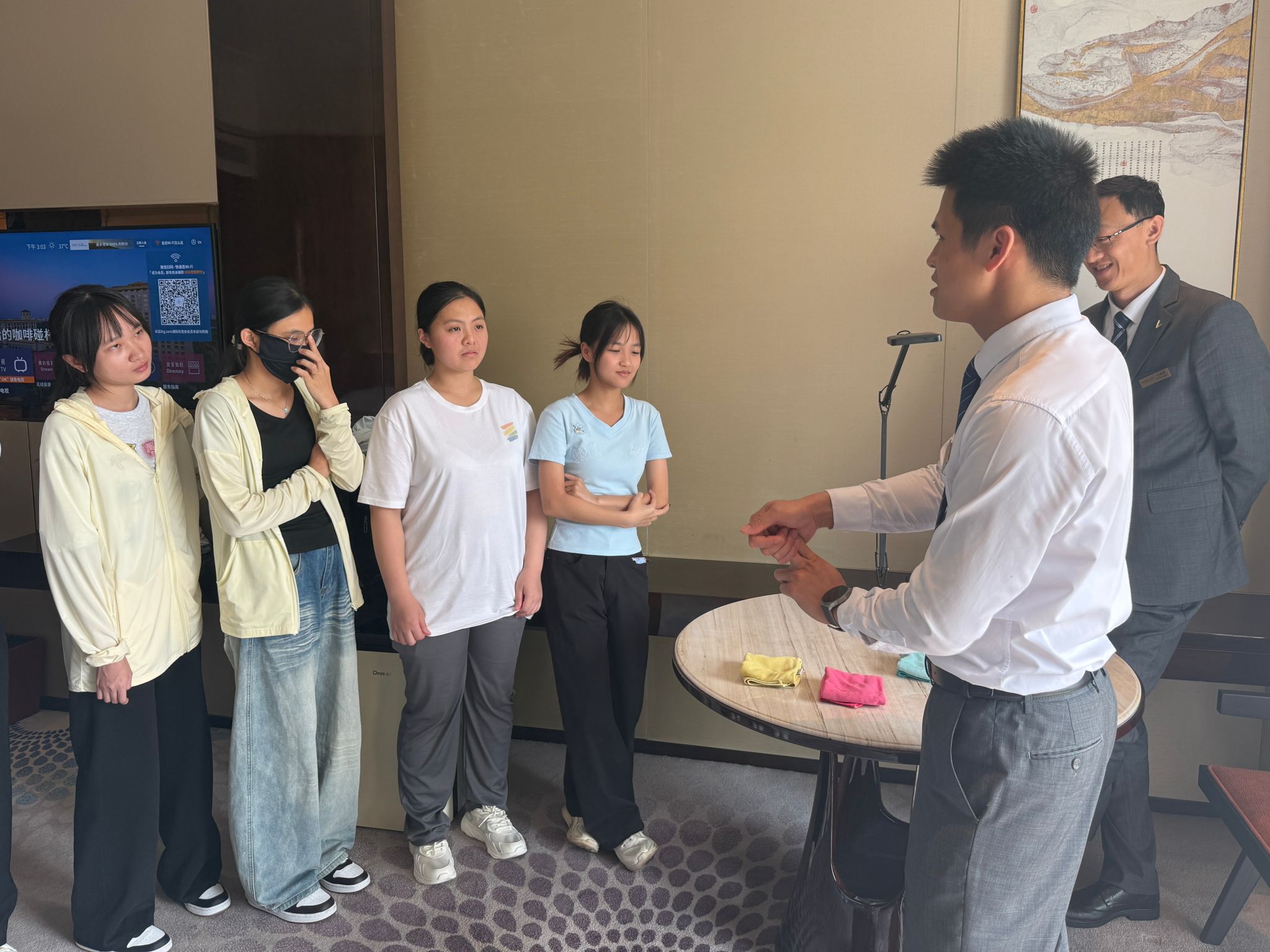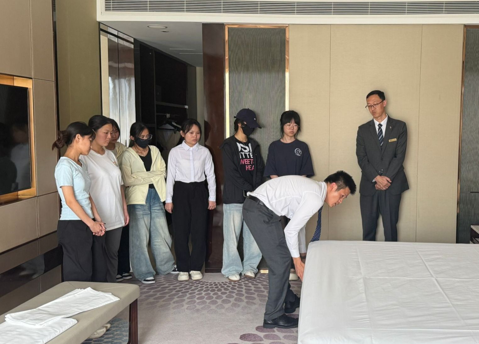 为进一步深化外国语学院与洲至奢选海口亚特酒店“订单班”培养工作,切实提升学生实践技能,2026年4月7日,学院组织订单班学生走进海口亚特酒店,在真实工作场景中学习客房服务操作技能。