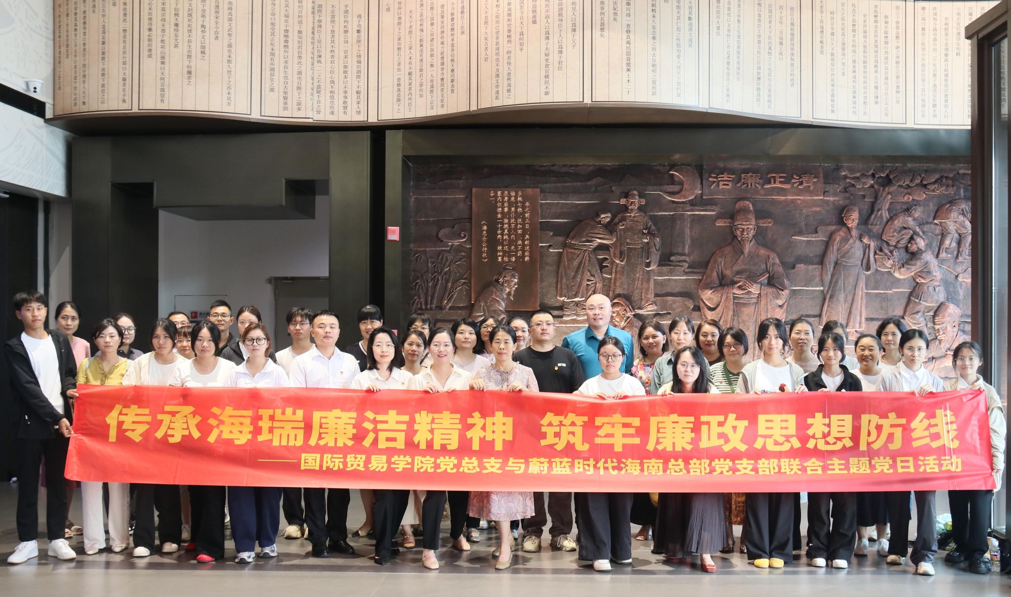 2026年4月14日,国际贸易学院党总支与蔚蓝时代海南总部党支部联合开展“传承海瑞廉洁精神 筑牢廉政思想防线”主题党日活动。校企40余名党员、入党积极分子齐聚一堂,共学廉洁文化、共悟初心使命。